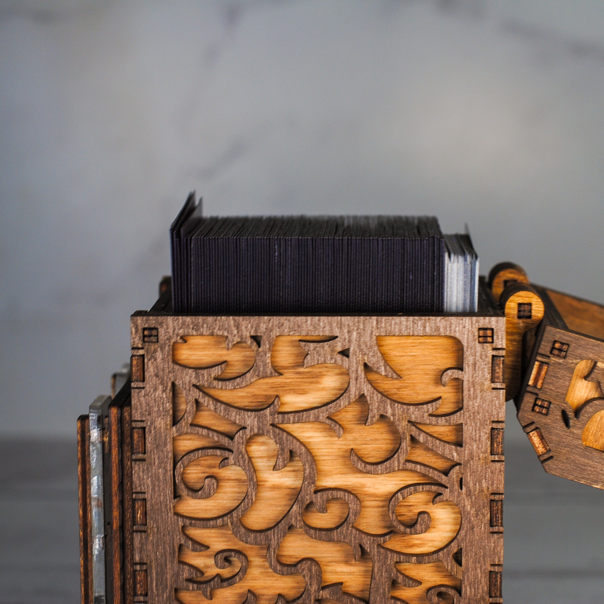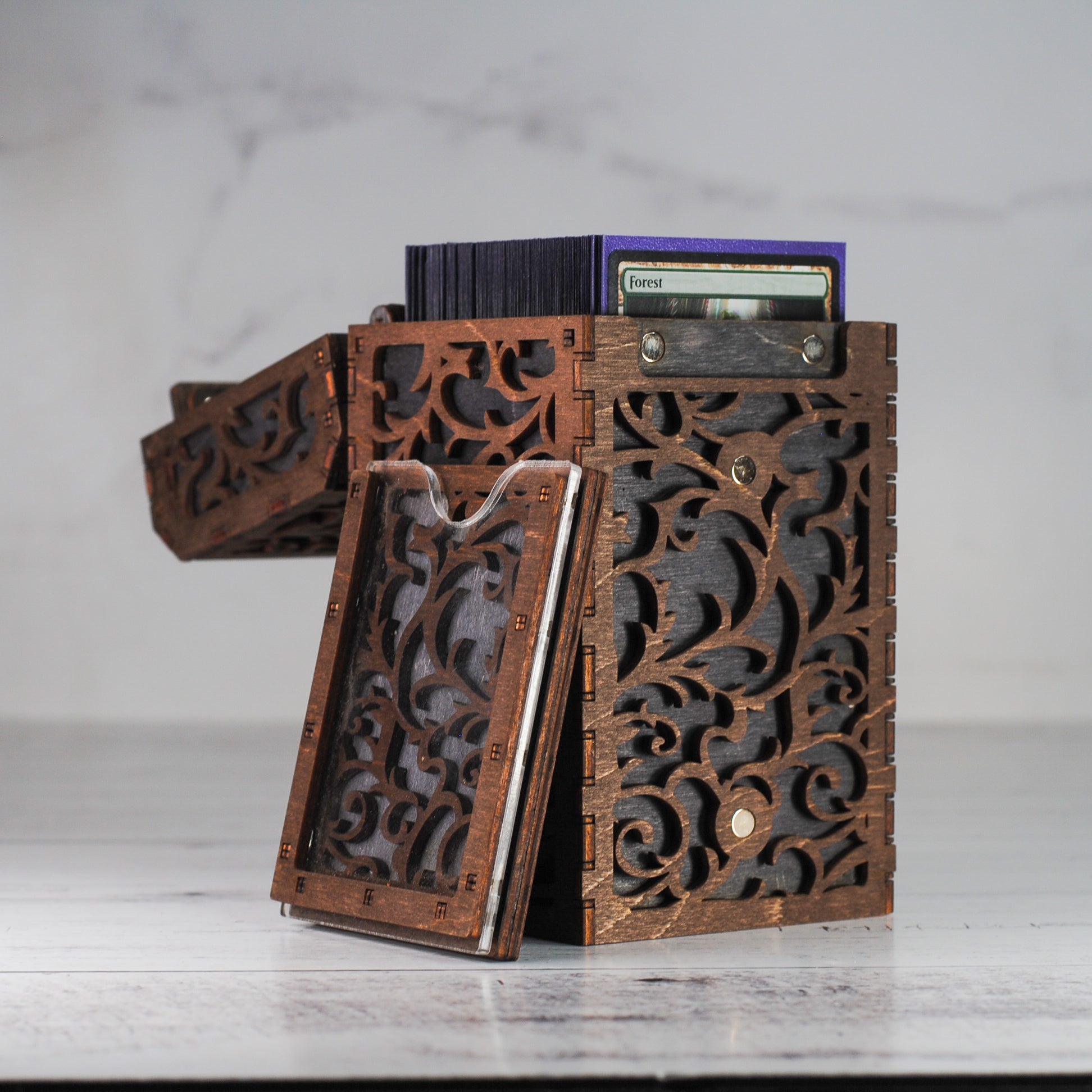 Our deck box securely holds 100 sleeved cards plus room for an additional 20 tokens.  But wait, there's more! Hidden within its mystical depths lies a secret drawer, perfect for stashing away your most precious artifacts, counters, dice or perhaps snacks?!