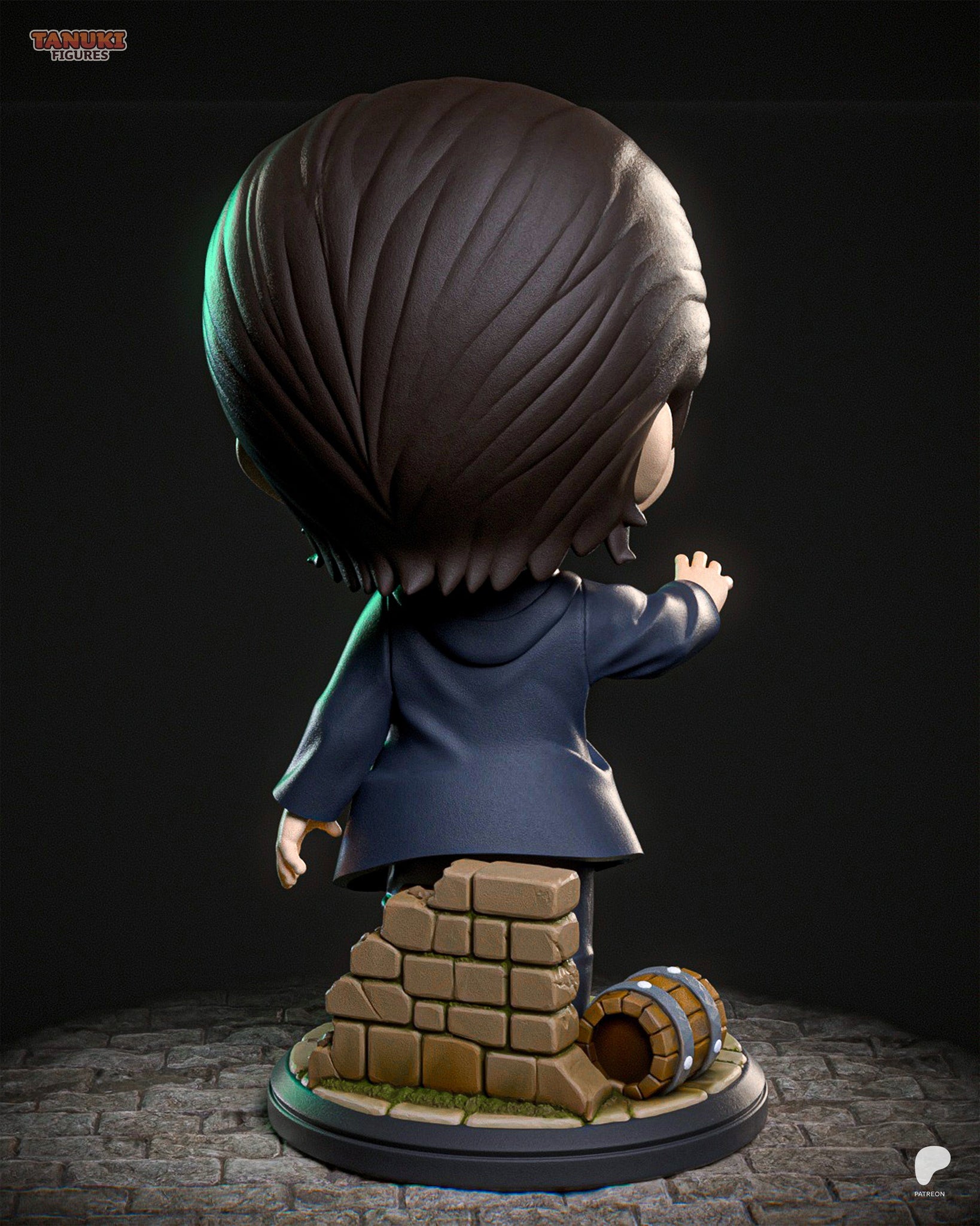 Chibi-style Eren Yeager figure from Attack on Titan, featuring his signature green eyes, parted dark hair, and casual outfit. Posed with one hand outstretched on a cobblestone base with a barrel and stone rubble, this adorable version is perfect for anime figure collectors and AoT fans.