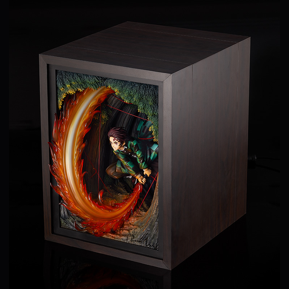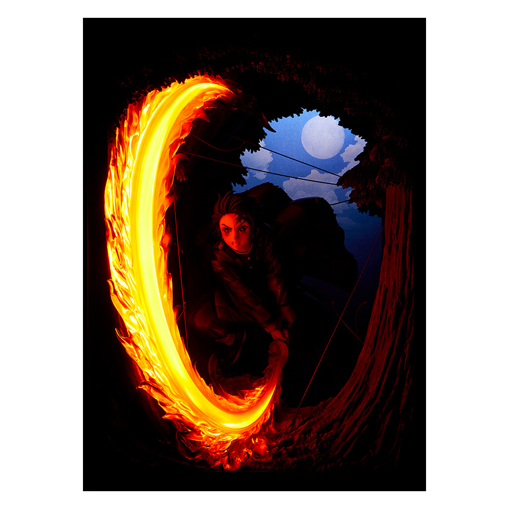 Tanjiro has been faithfully captured in figure form in his appearance from the 19th episode of the anime's first season, using the Hinokami Kagura Dance technique for the first time. Even the background from the scene has been preserved in figure form. In pursuit of perfectly capturing the atmosphere of the scene, the background of the scene has been constructed to enclose the figure. By crafting the figure in such a way, the scene's lighting and Rui's thread have been preserved in stunning detail. This unique construction makes for a figure unlike anything seen before.