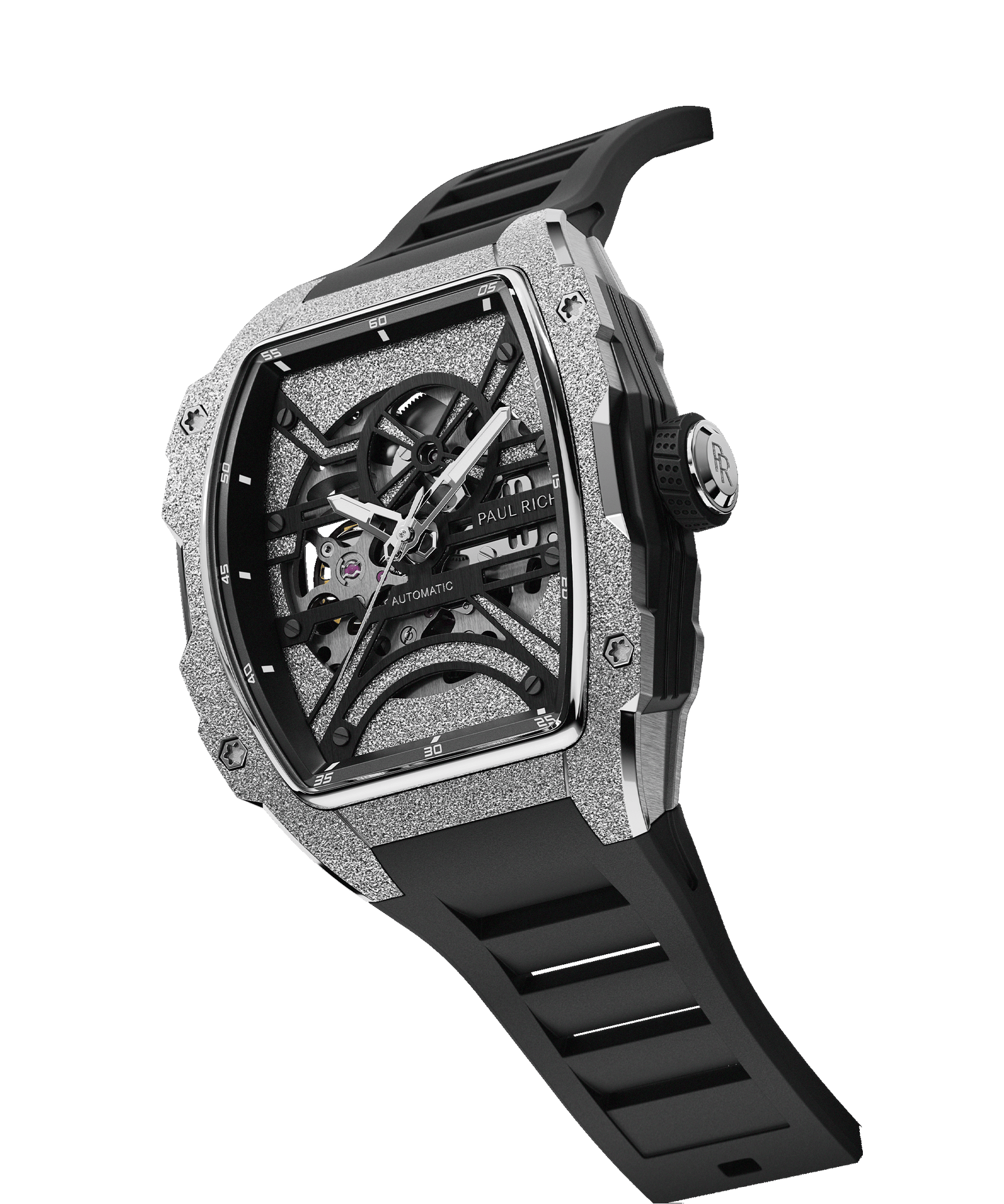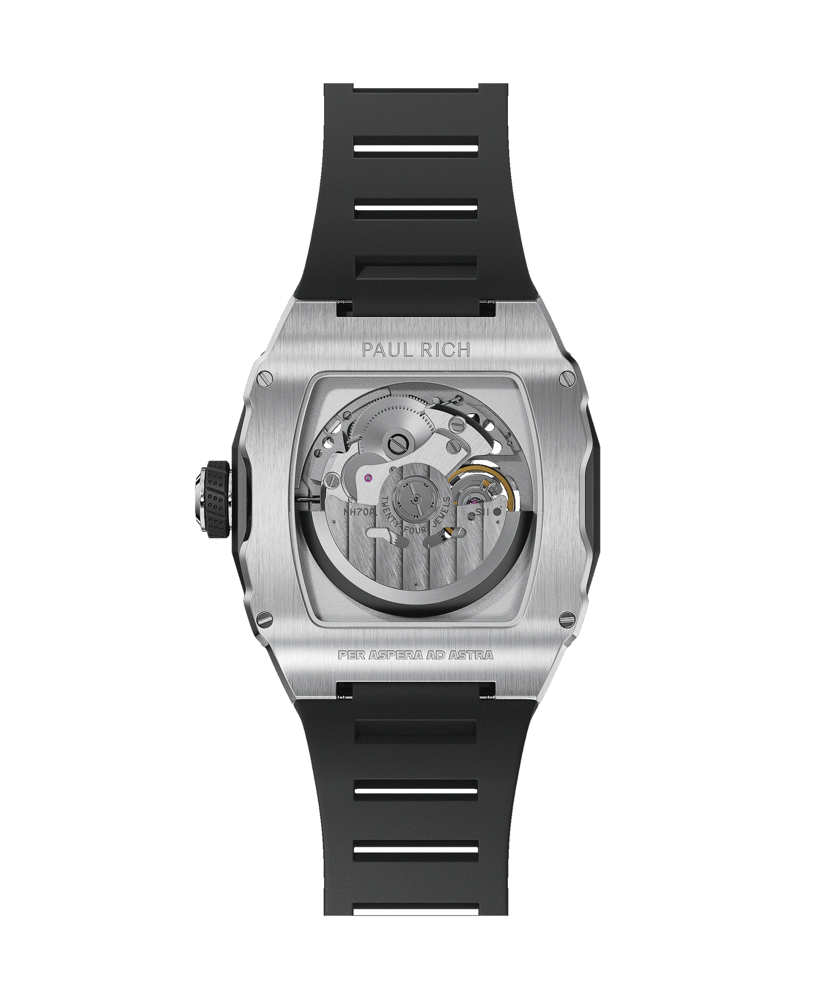 Introducing the Paul Rich Astro Skeleton—a tonneau-shaped masterpiece that seamlessly integrates innovation with sophistication. Its transparent skeleton dial unveils the intricate mechanics beneath, showcasing frosted baseplates and bridges. You can also appreciate the movement within through the open case back.