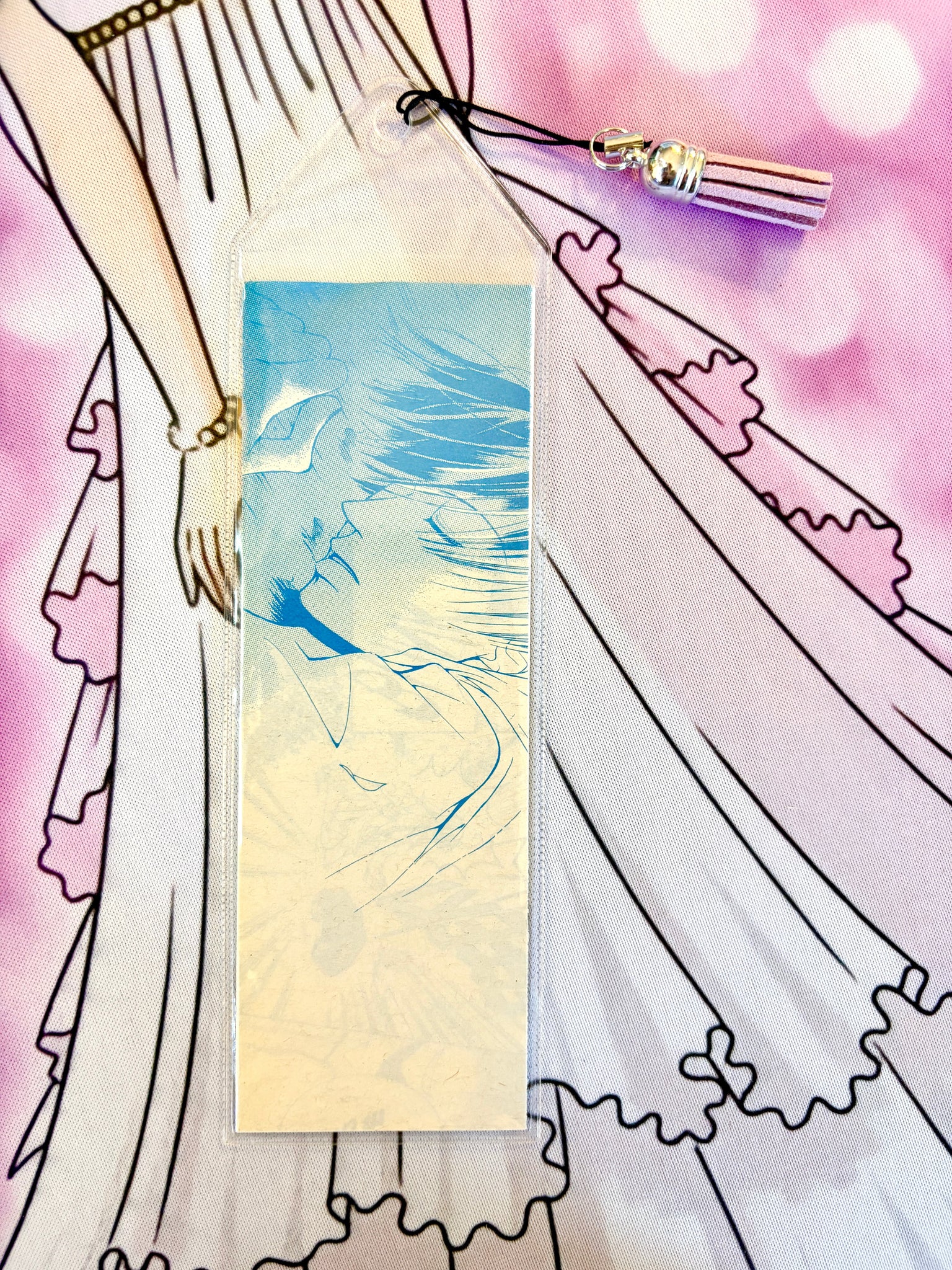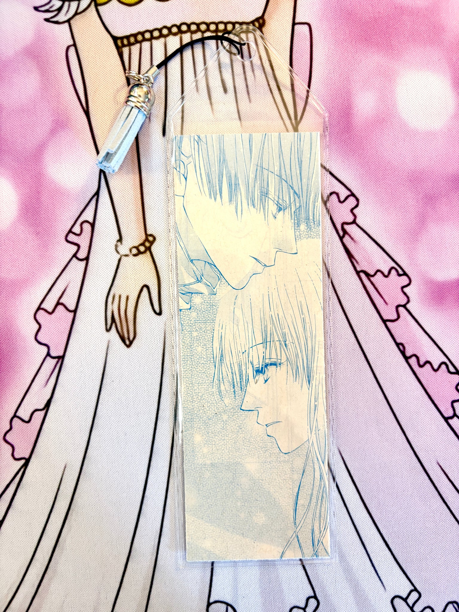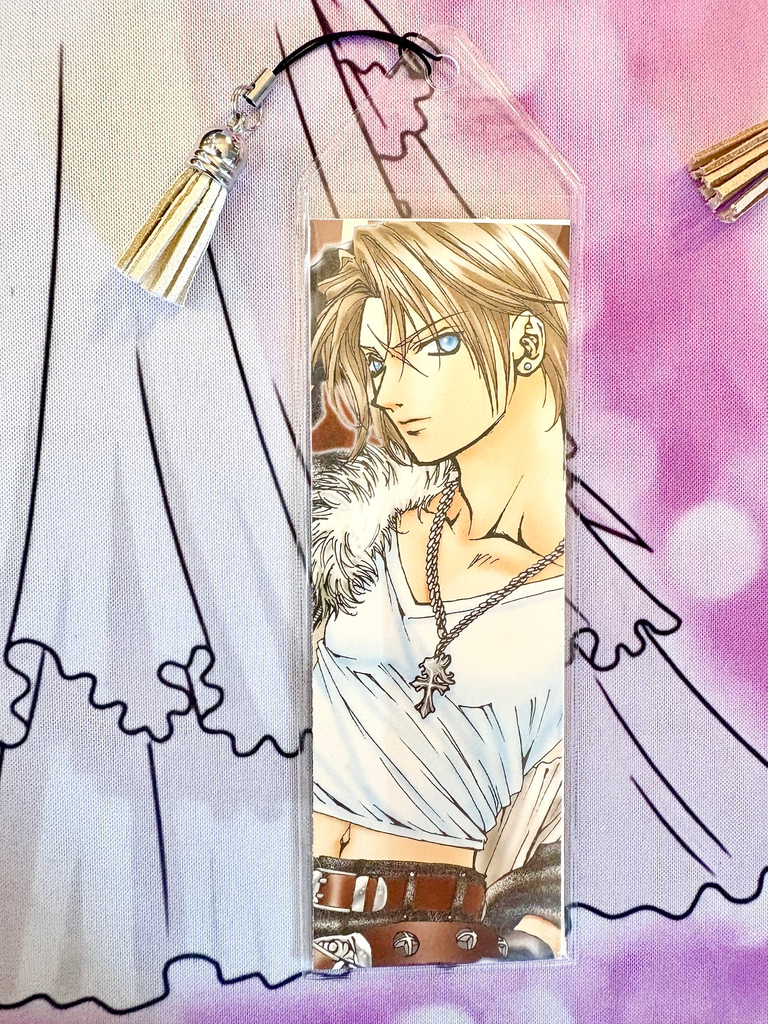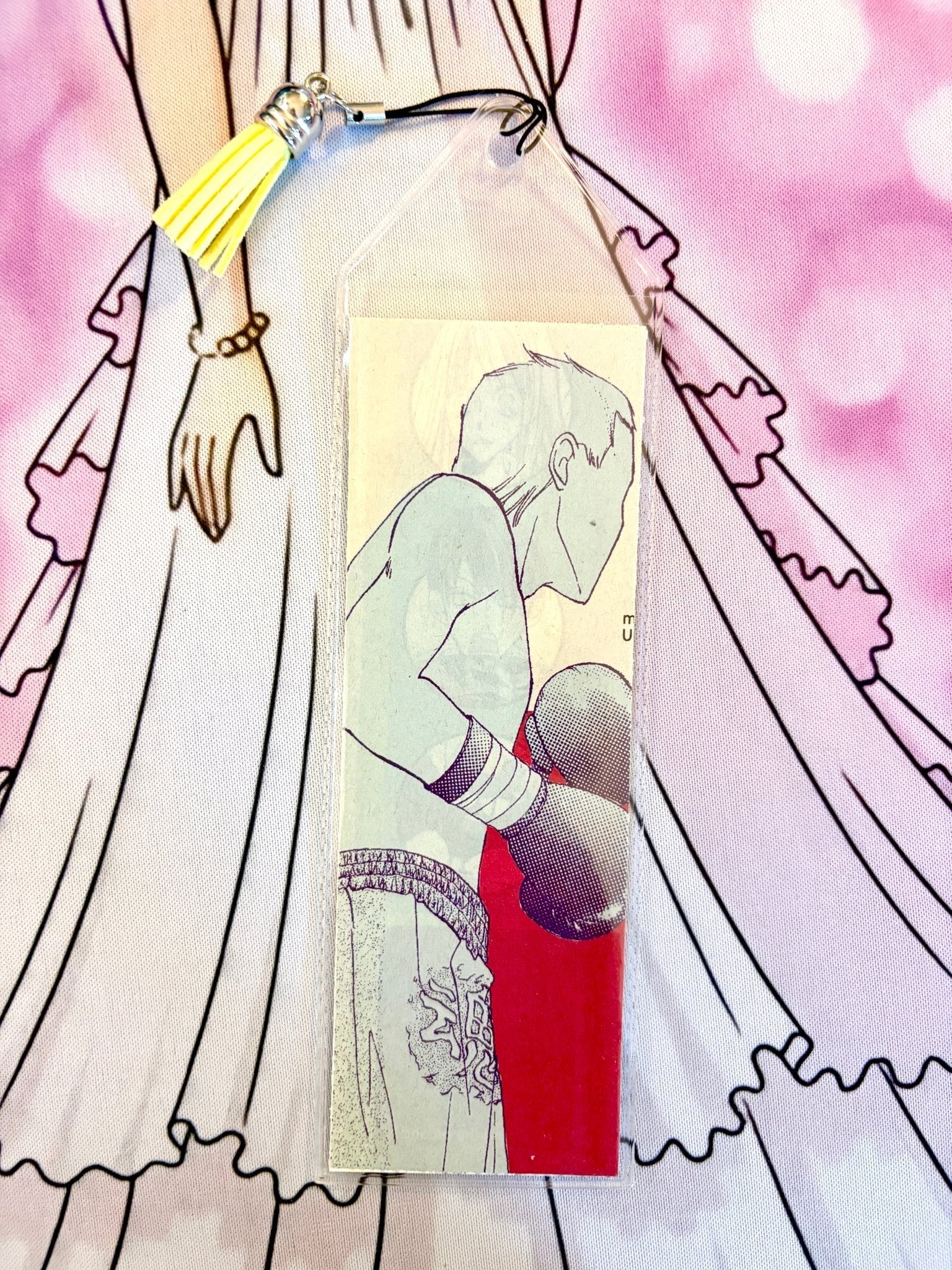 Get a bookmark made by us from recycled manga!!! No sellable manga was harmed during the making of these bookmarks! We only use samplers, heavily damaged copies, manga magazines and paraphernalia, and non English manga to make our crafts. Each bookmark has a memorable scene from manga on the front and our store bookmark on the back. Each has a leather tassel too! Fancy right???