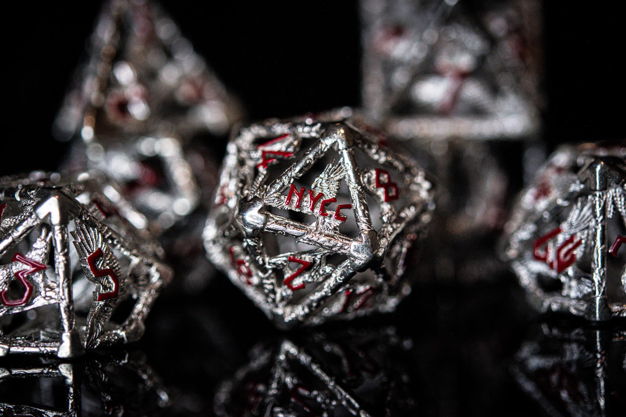 Get rolling with this striking silver dice set! Made for New York City Comic Con, these dice feature NYCC on the D20. Our own Misty Mountain Gaming dice design team crafted unique, detailed patterns of ravens, wolves, and snakes - a thrilling addition to your collection!
