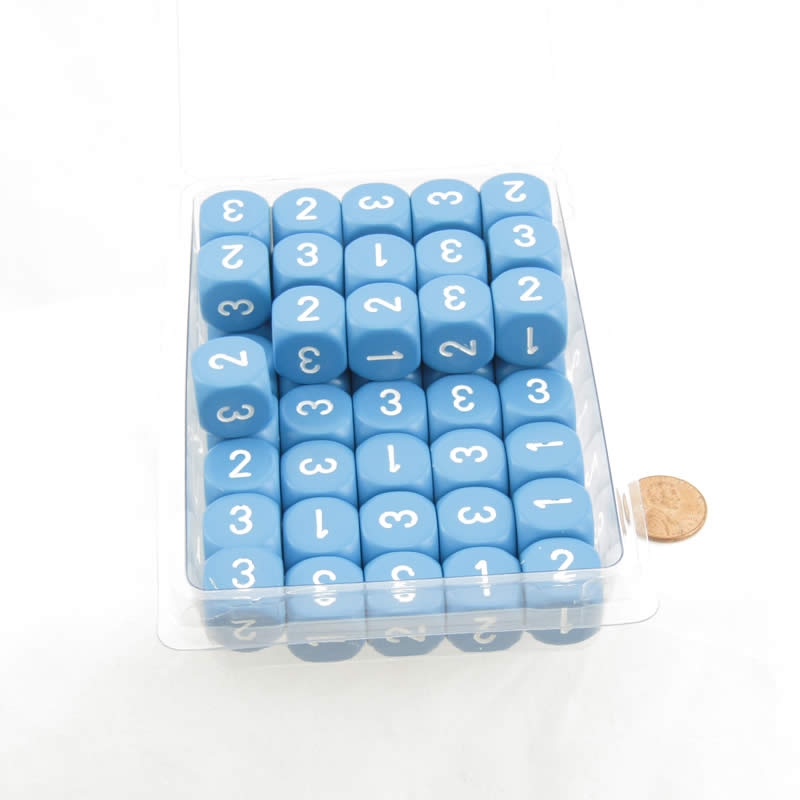 WCXXQ0316E50 Light Blue Opaque Dice White Numbers D3 (D6 1-3 Twice) 16mm (5/8in) Pack of 50 (ONLINE ORDER ONLY)