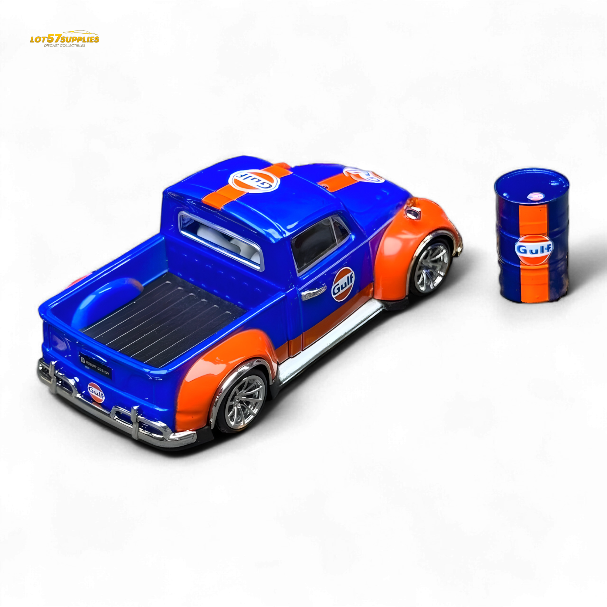 Fuel up your collection with this bold Gulf-themed custom VW Beetle truck! Drenched in the legendary blue and orange racing livery, this 1:64 scale diecast features chrome bumpers, detailed headlights, and performance wheels. Comes with a matching Gulf oil drum prop, perfect for diorama setups or static display. A must-have for vintage motorsport fans and diecast legends alike.