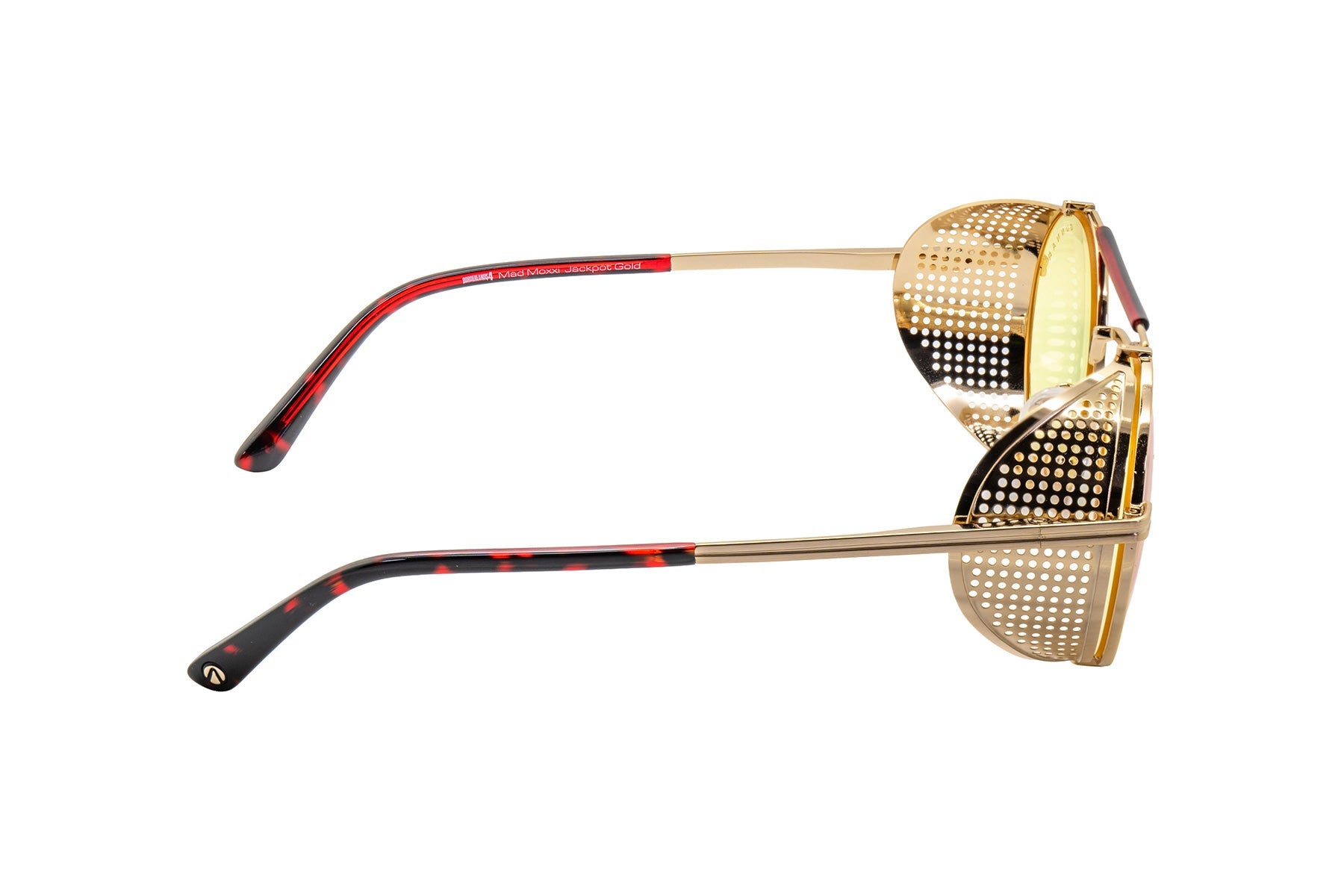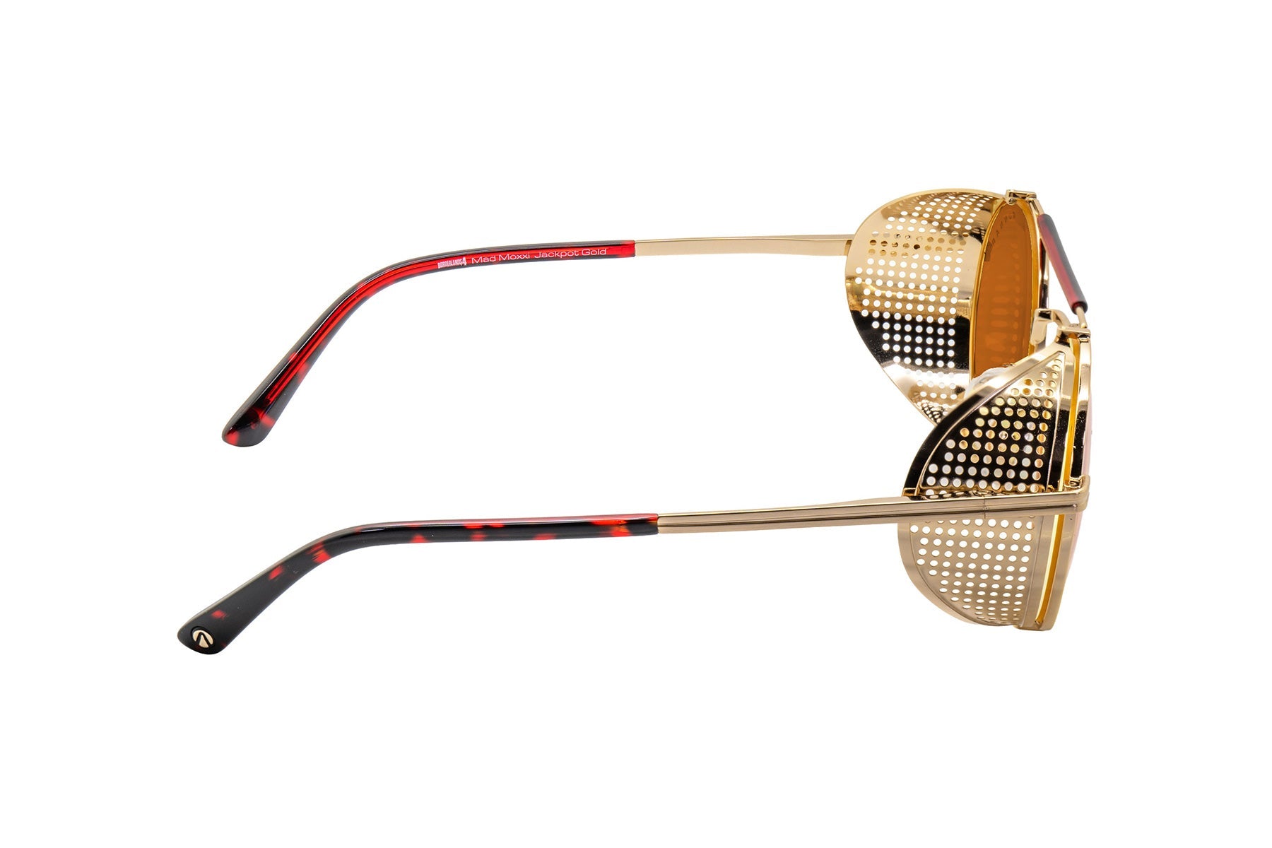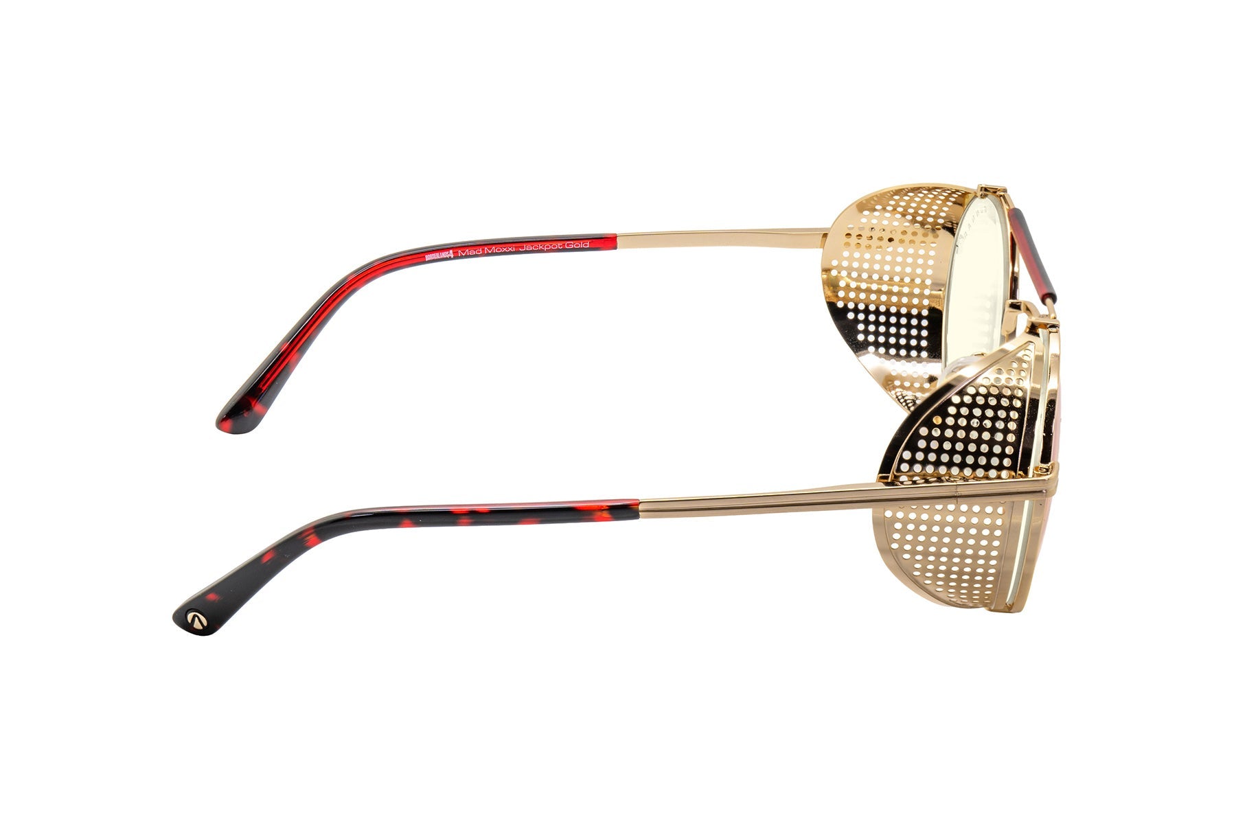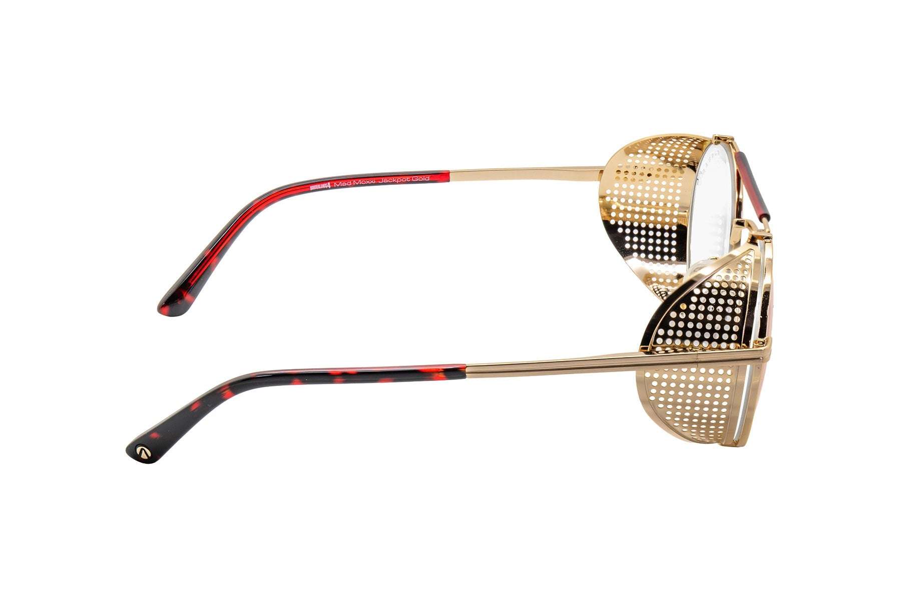 • Bold round stainless steel frame features a gold-tone finish with removable intricate mesh side shields