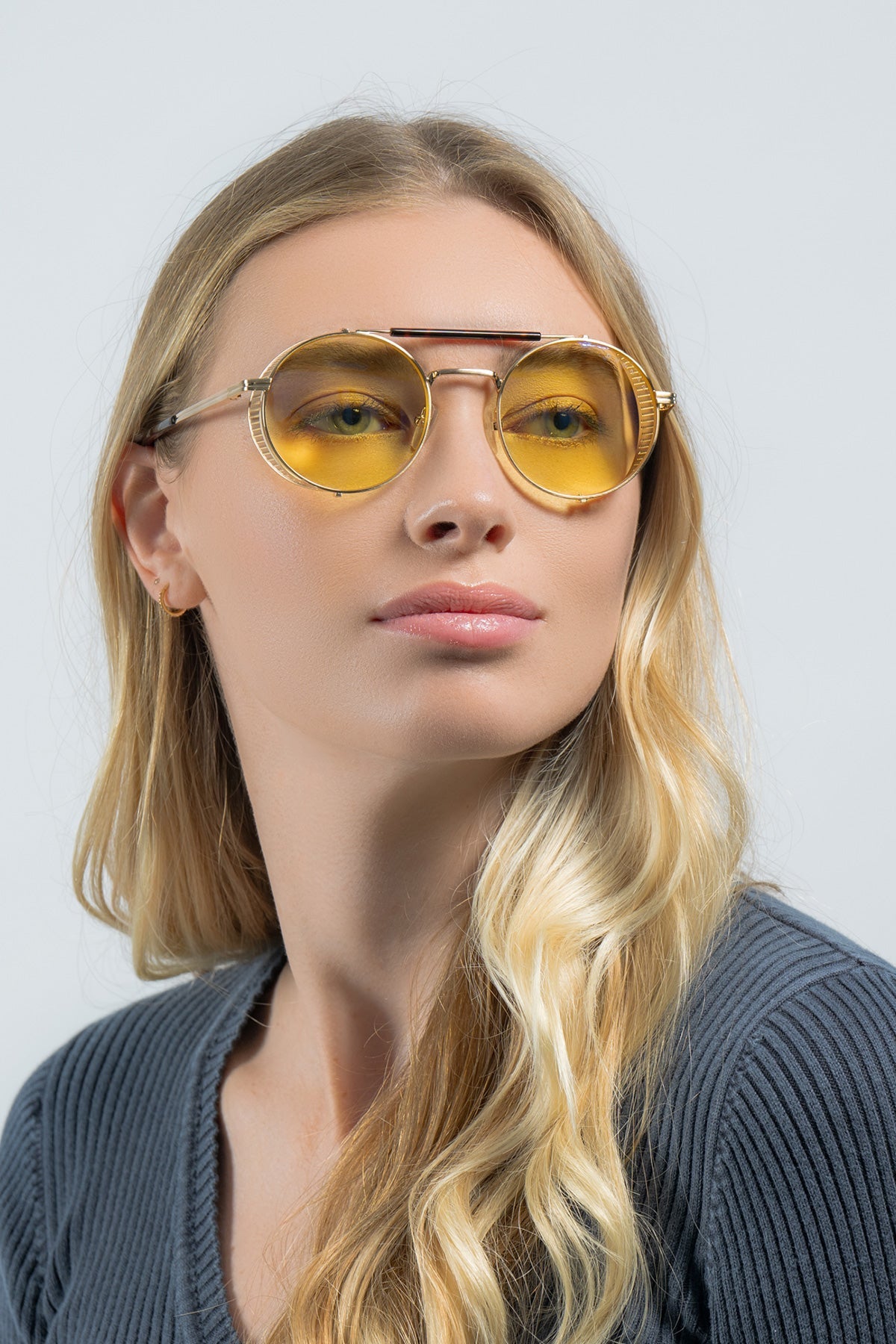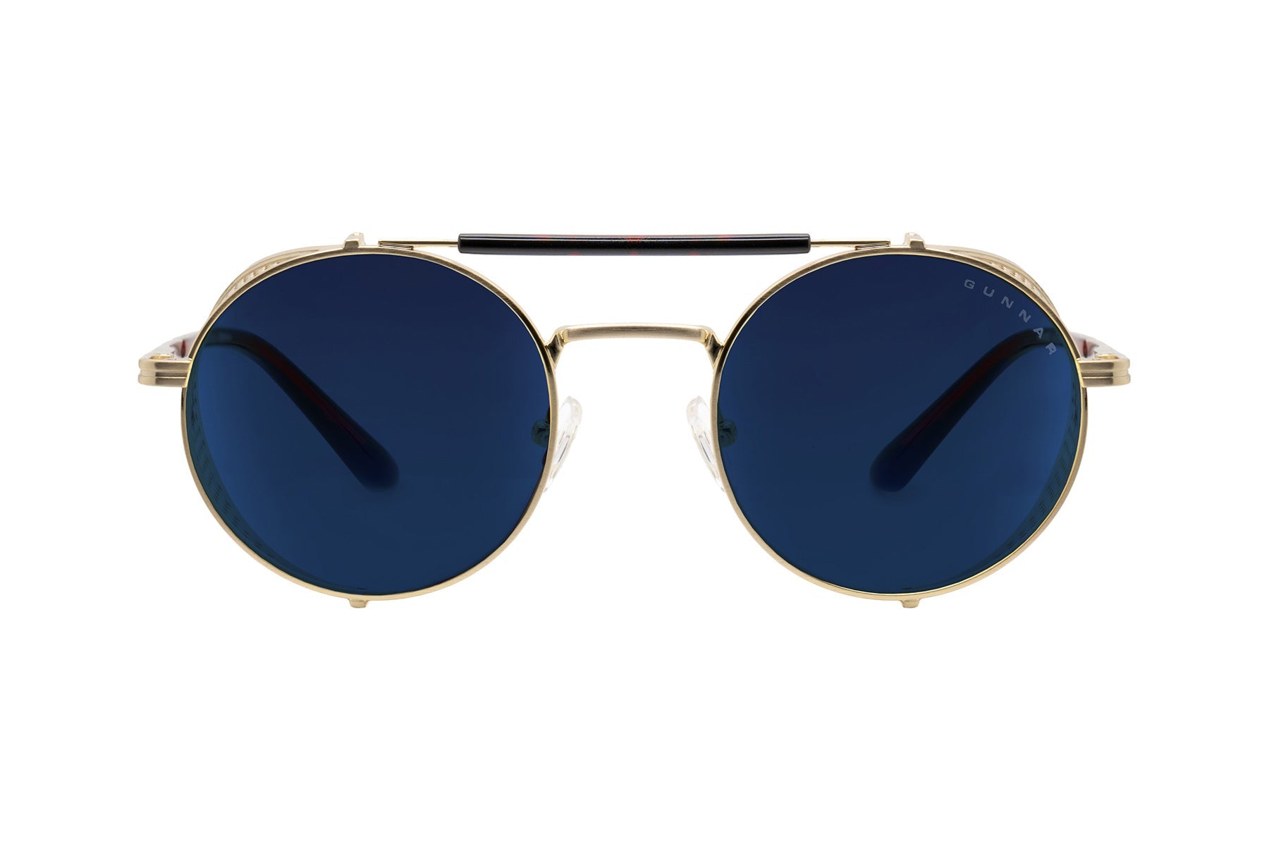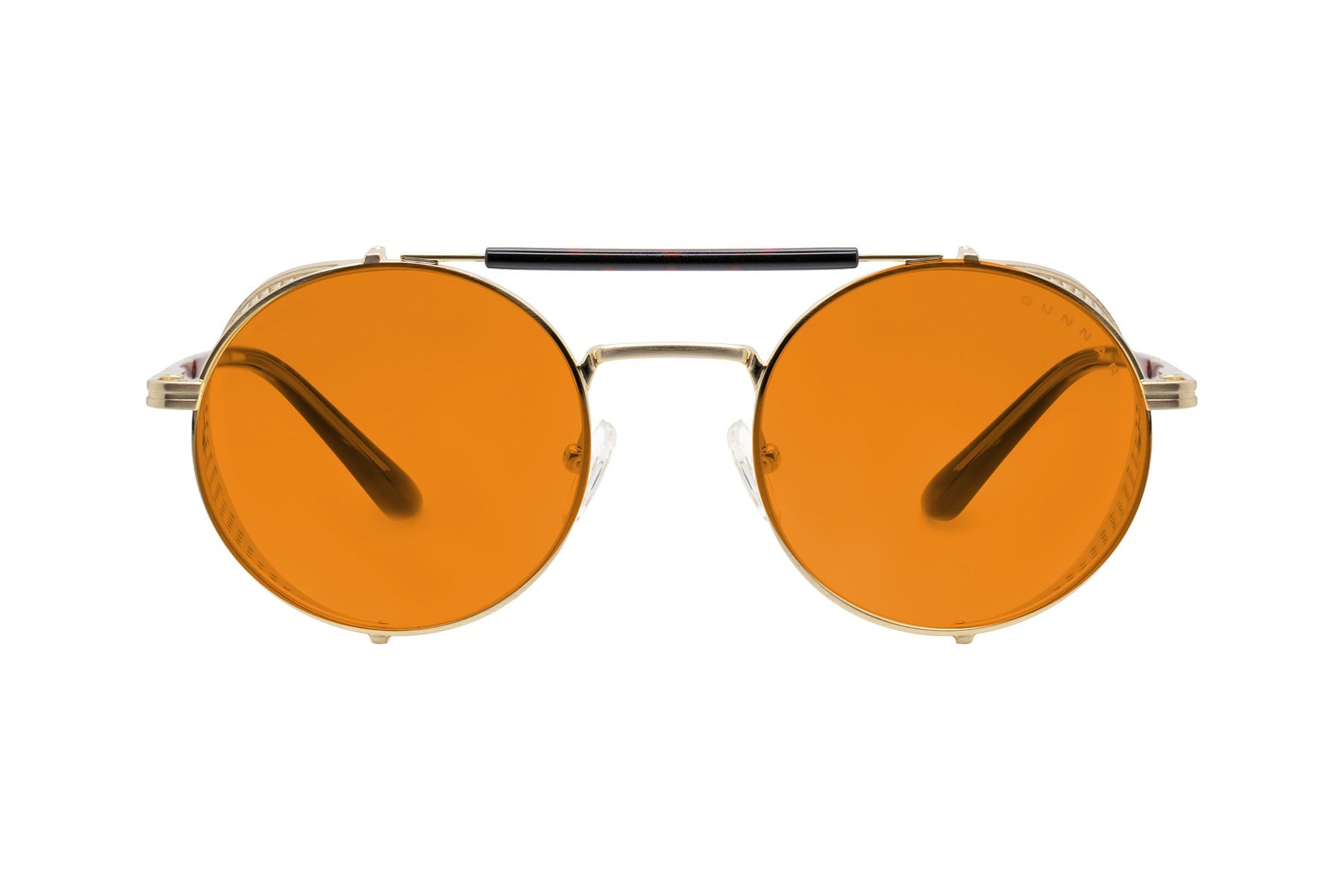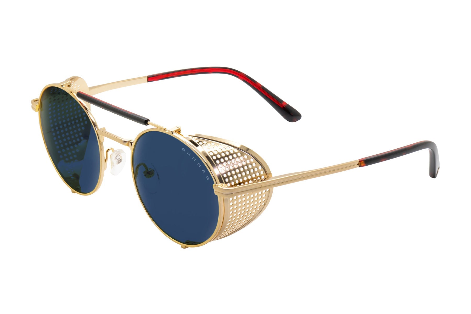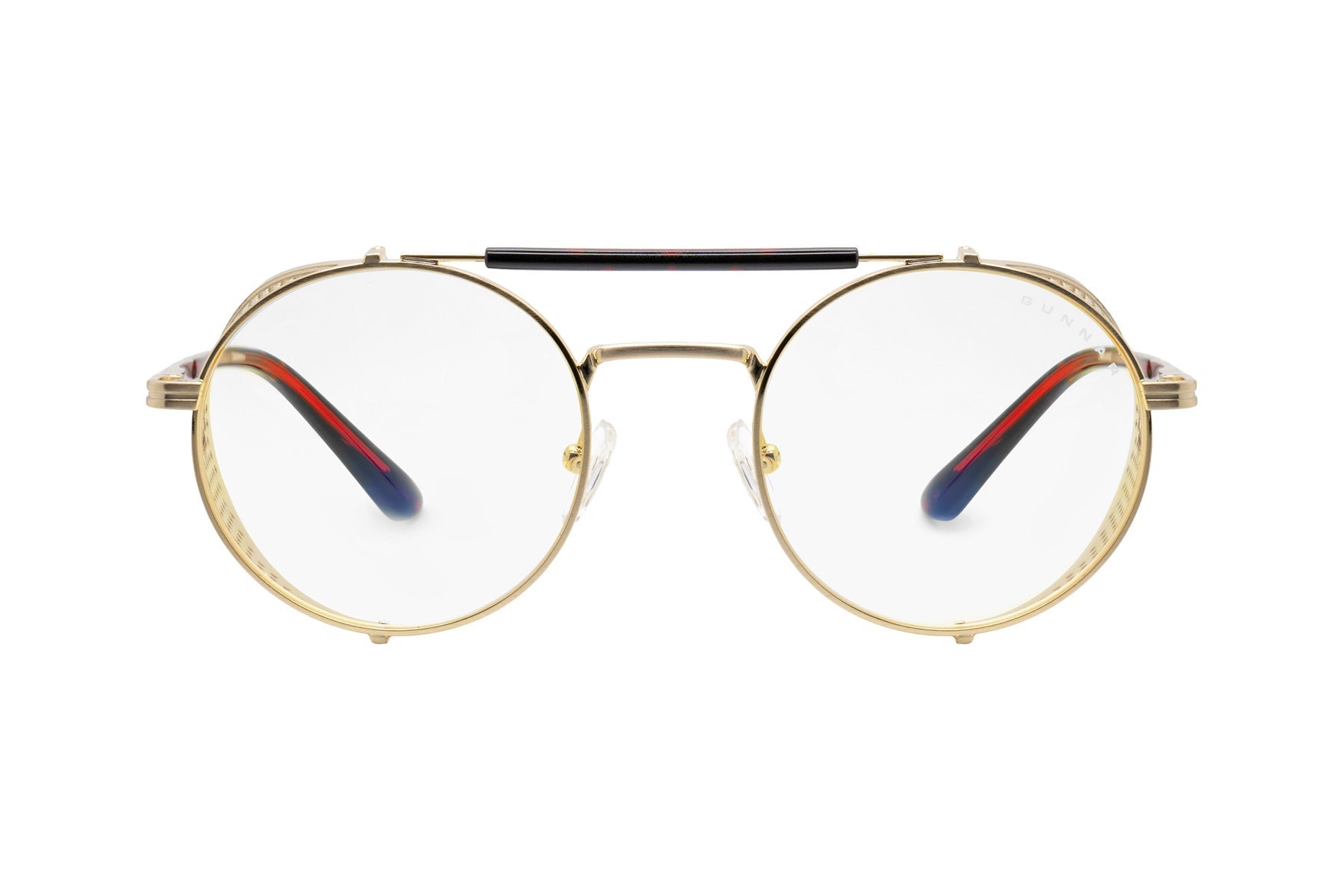 • Bold round stainless steel frame features a gold-tone finish with removable intricate mesh side shields