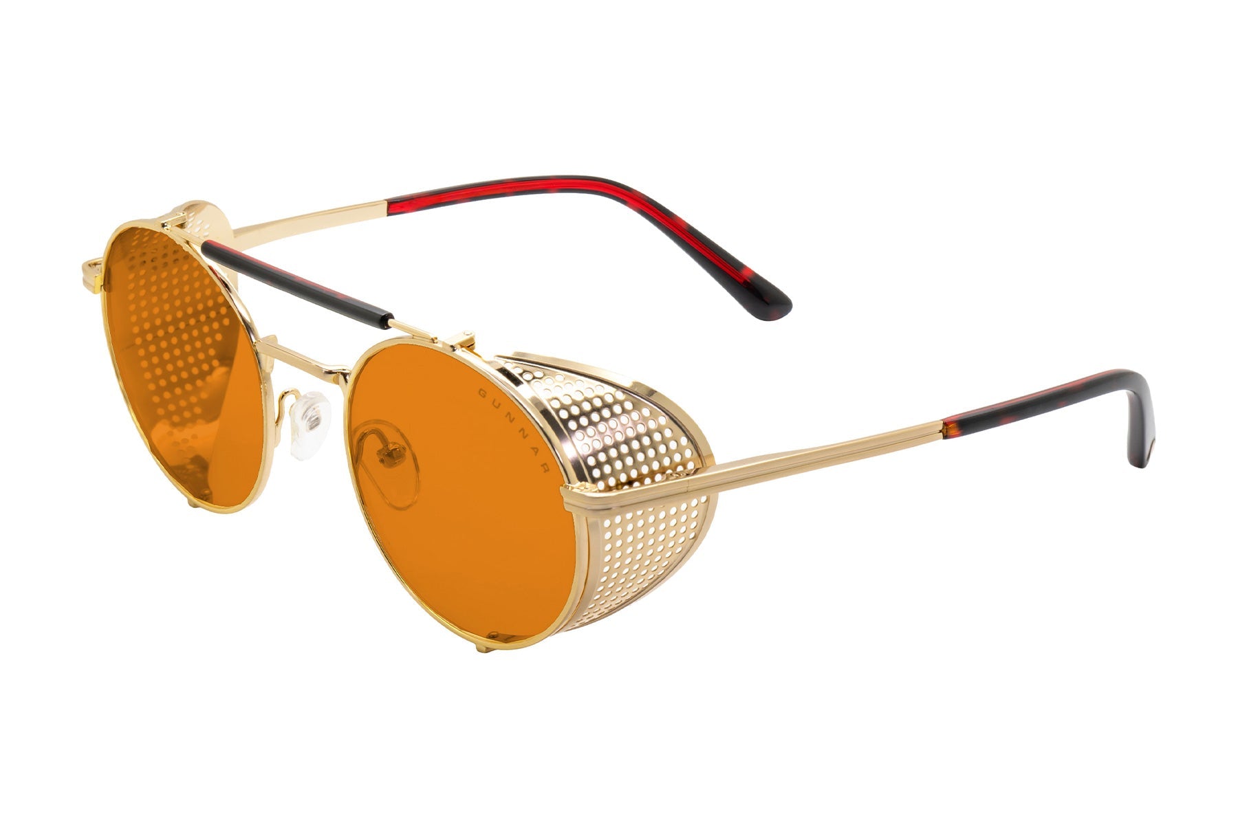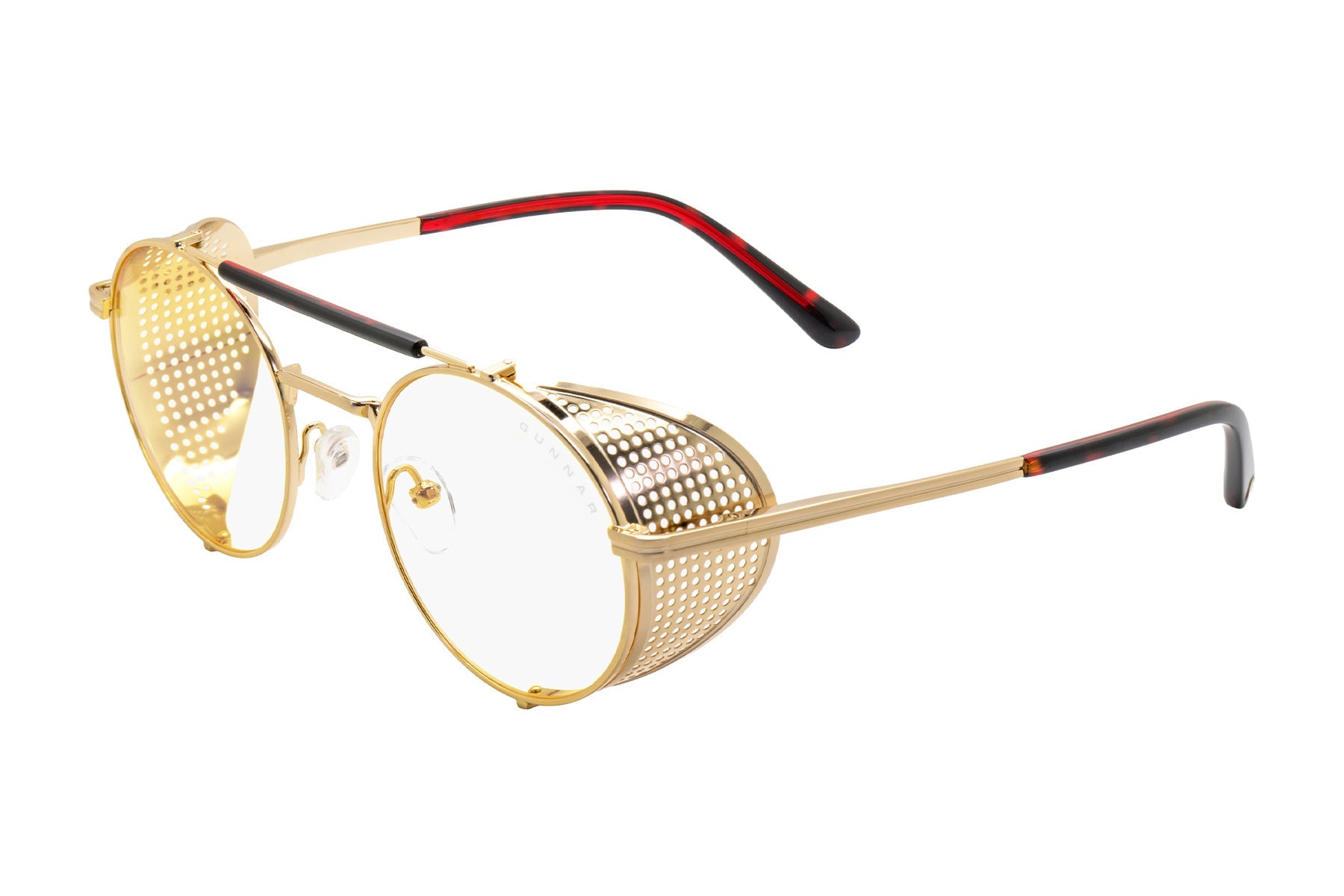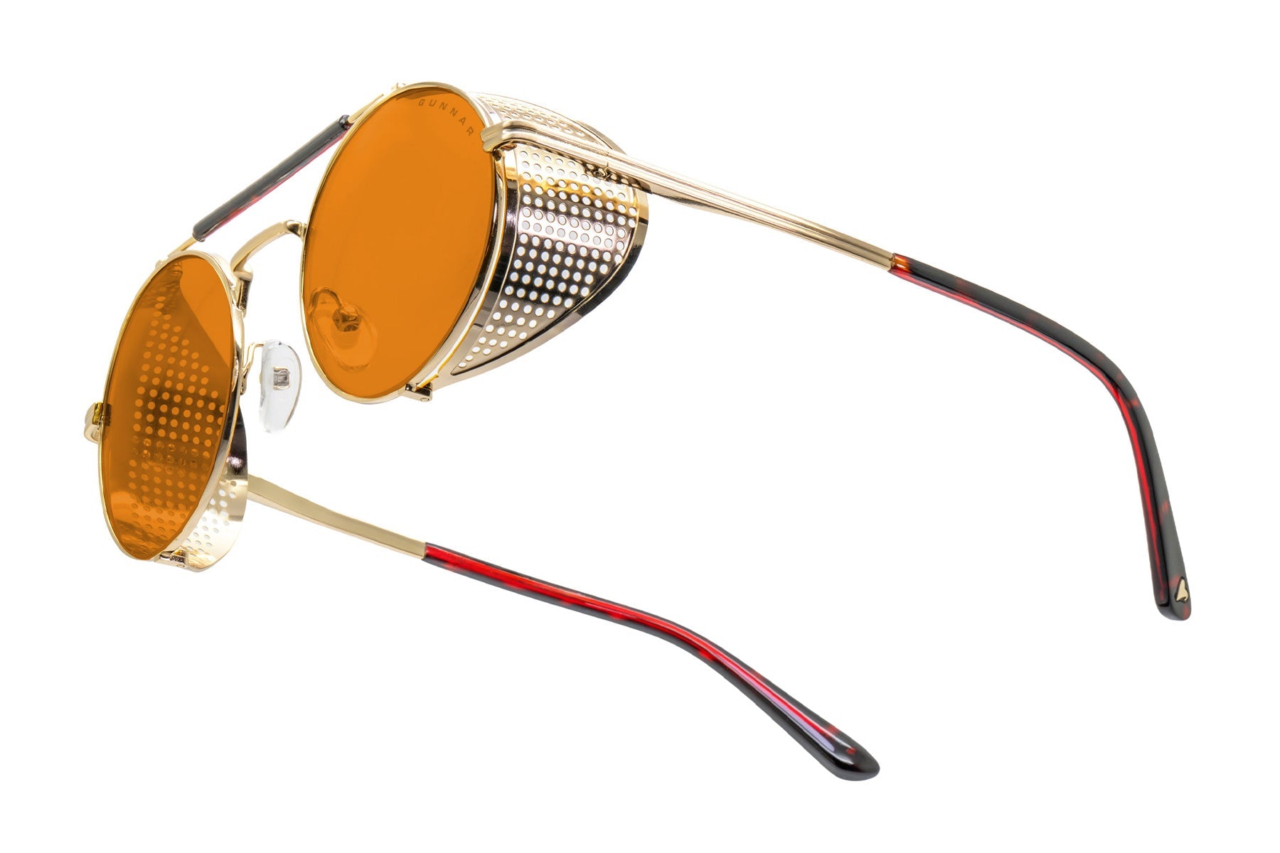 Place your bets on chaos. Introducing Borderlands 4: Moxxi glasses — a daring, steampunk-inspired design dripping with charisma and danger, just like Pandora’s most infamous hostess. The bold, round frame boasts a gold-tone finish with removable mesh side shields, adding a touch of flair with a side of mystery. A heart engraving on the lens and gold heart details on the temple tips reflect Moxxi’s signature style, while deep red temple arms pay tribute to her iconic color scheme. Available in two signature GUNNAR tints — Amber and Amber Max — these glasses are equipped with GUNNAR’s patented lens technology to protect against digital eye strain. Each pair comes with a custom microfiber cloth featuring Moxxi’s sultry portrait, a matching pouch with Borderlands — themed patterns, and a premium faux-leather case with a vault-inspired clasp. The perfect epic loot drop for any Vault Hunter ready to deal in mayhem.