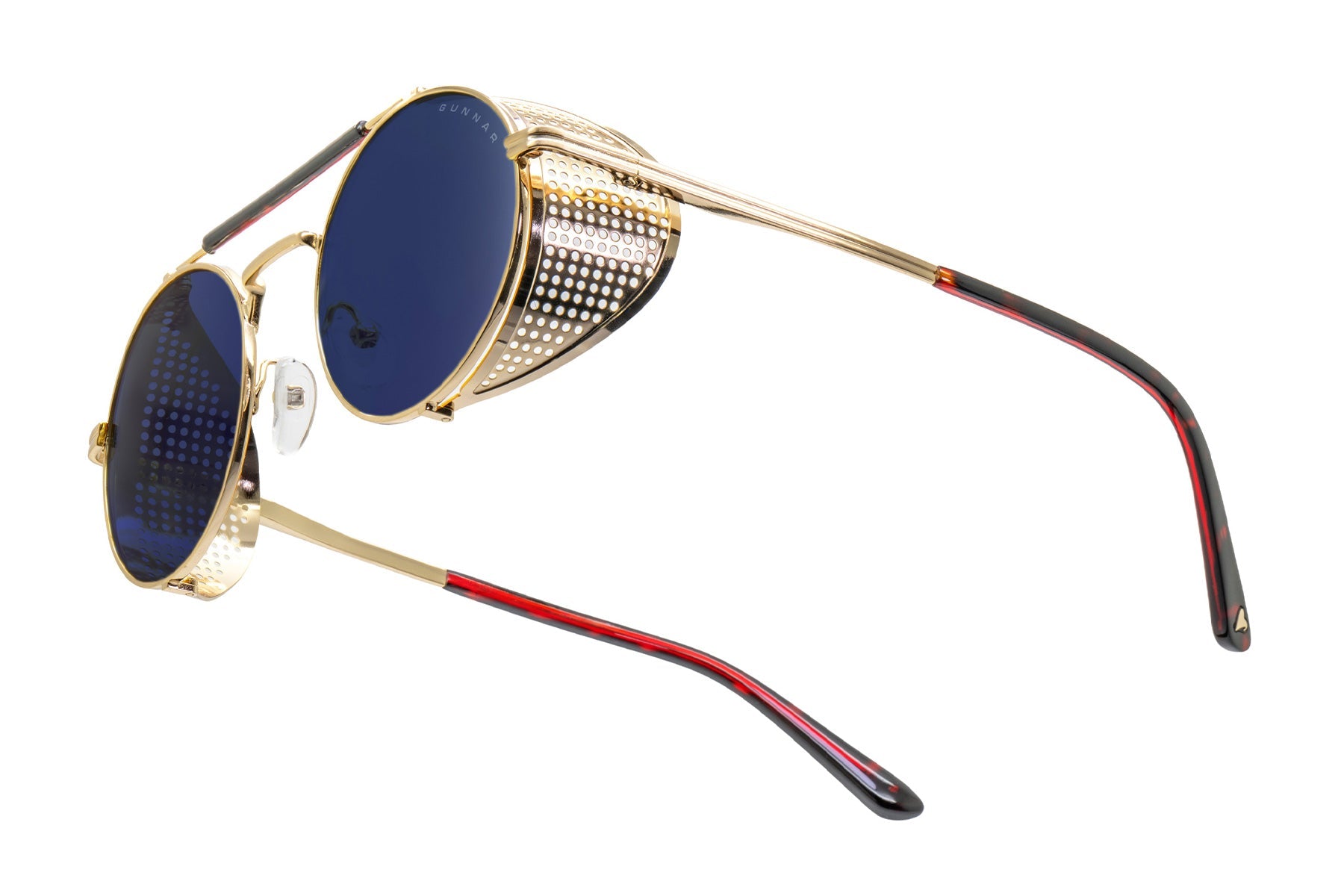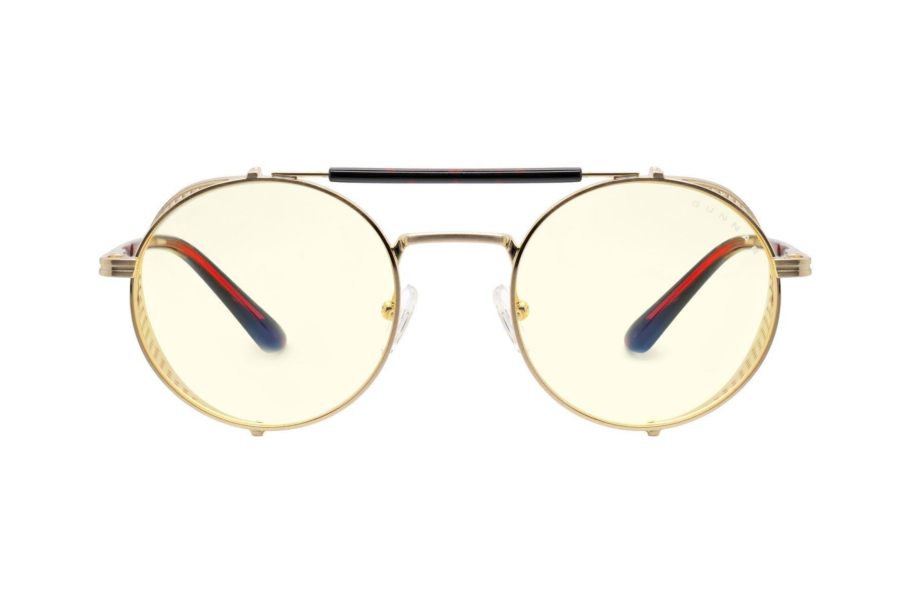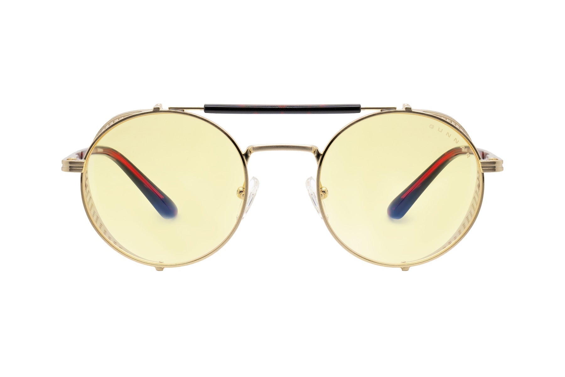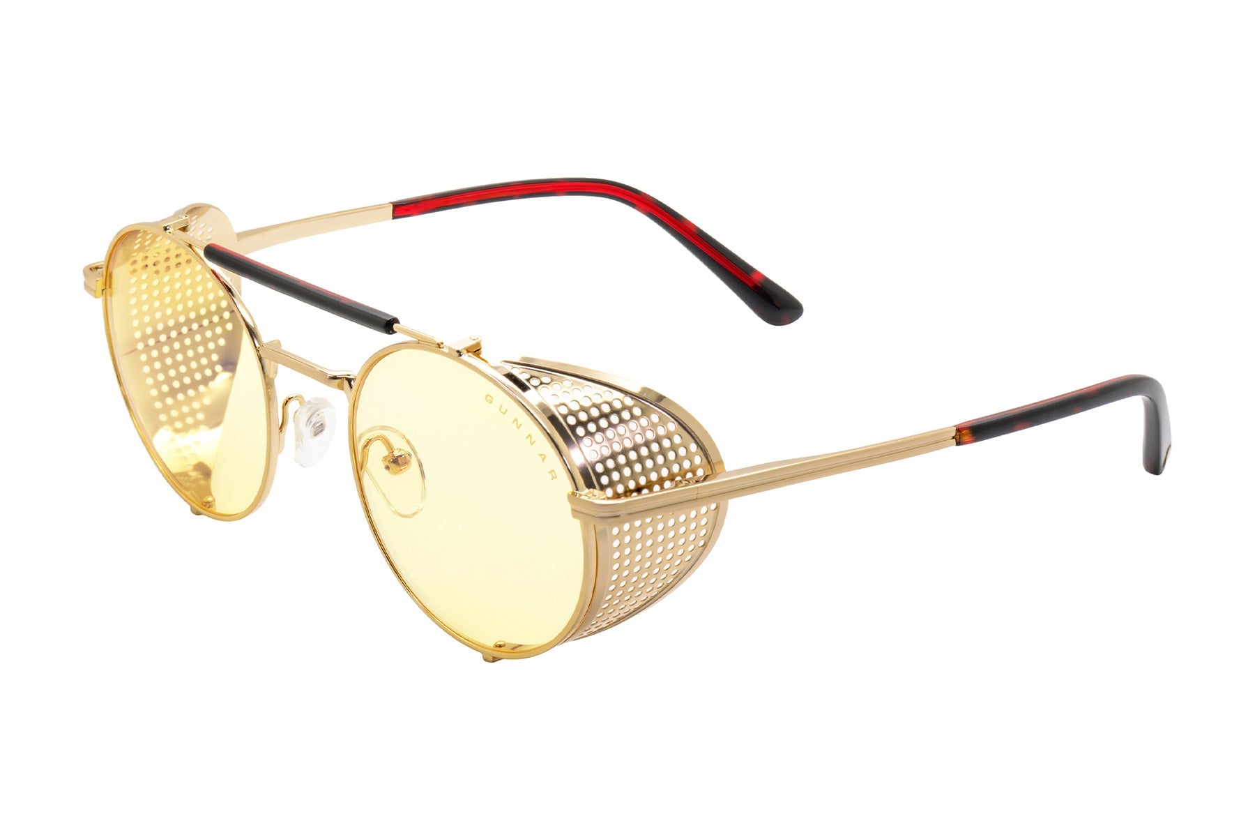Place your bets on chaos. Introducing Borderlands 4: Moxxi glasses — a daring, steampunk-inspired design dripping with charisma and danger, just like Pandora’s most infamous hostess. The bold, round frame boasts a gold-tone finish with removable mesh side shields, adding a touch of flair with a side of mystery. A heart engraving on the lens and gold heart details on the temple tips reflect Moxxi’s signature style, while deep red temple arms pay tribute to her iconic color scheme. Available in two signature GUNNAR tints — Amber and Amber Max — these glasses are equipped with GUNNAR’s patented lens technology to protect against digital eye strain. Each pair comes with a custom microfiber cloth featuring Moxxi’s sultry portrait, a matching pouch with Borderlands — themed patterns, and a premium faux-leather case with a vault-inspired clasp. The perfect epic loot drop for any Vault Hunter ready to deal in mayhem.