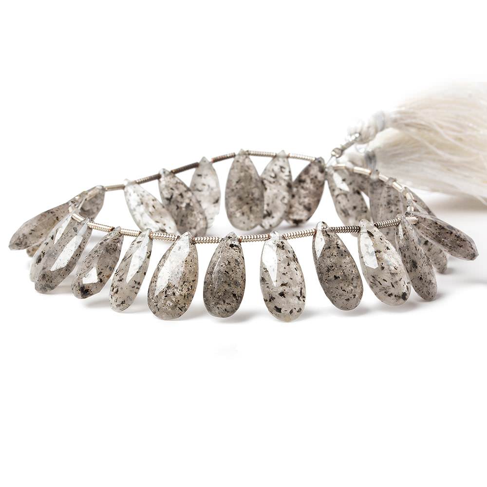 Mossy Quartz Pear Briolettes measure approximately 13x6mm to 15x7mm, have a high brilliance with good faceting showing small pitting on some stones, fairly symmetrical shapes with a depth of 4mm on average, and the bead bodies are a mossy light greyish green due to the brownish green inclusions within the stones.
