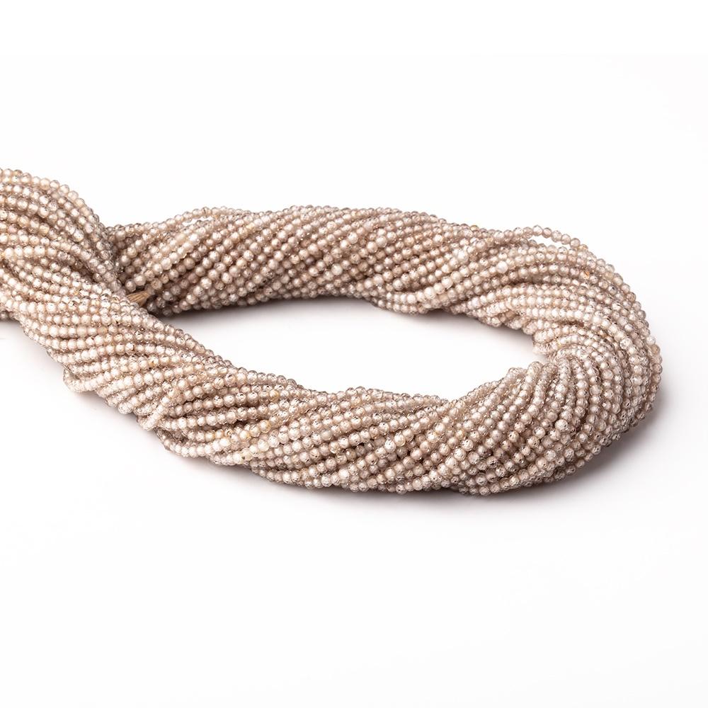 Champagne Zircon showing light Rose' tone on the approximately 3mm average in diameter Micro Faceted Rondelles. These Zircon beads have a vitreous luster, an exceptionally high brilliance, a near diamond like luster, exceptional faceting and shape, and the sparkling gem bodies are a lightly saturated Rose' toned champagne hue for an exceptional strand of Zircon which resembles the best features of diamond - high luster and excellent refraction of light. AAA grade
