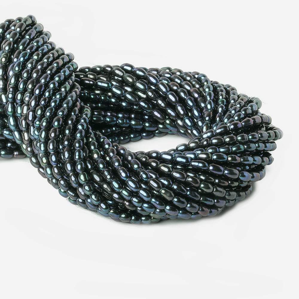 Large Hole Straight Drilled Oval Freshwater Pearls have excellent high luster, pearls have excellent nacre, are well matched for quality on strand, are straight drilled with a 1.5mm hole, and are an excellent value for an average size & well made freshwater pearl oval shape. The pearl has a deep bluish green base with a strong iridescent peacock overtone. Large Hole pearls have a 1.5mm inside diameter. The drill holes are produced with a 5 step drill process to insure a cleanly drilled hole without abrasion to the nacre and the drill hole is a consistent diameter through the pearl.