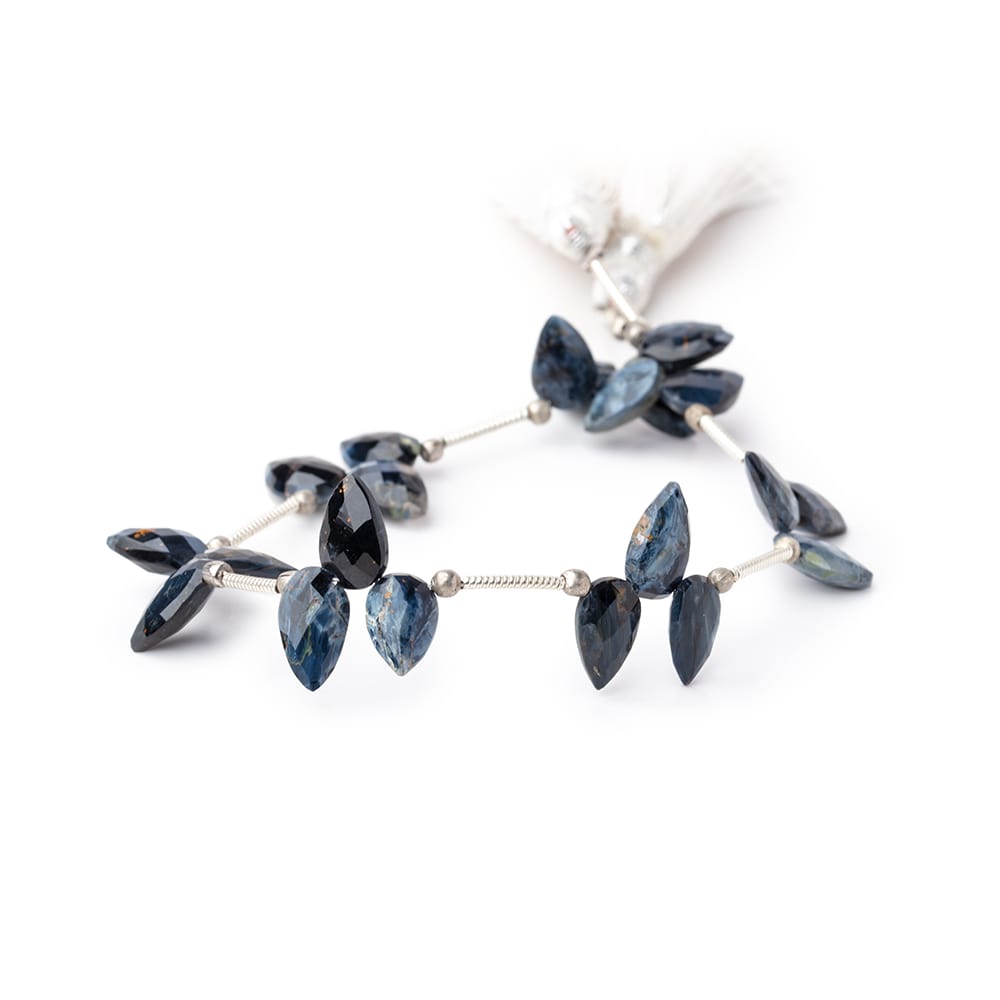 Pietersite Shoulder Drilled Faceted Pears measure approximately 8x5mm to 9x6mm in size, have a vitreous luster showing Chatoyancy, the gems are a medium to dark denim blue hue with a chatoyant phenomenon to each stone, the gems have symmetry with excellent faceting and polish, beads have a dark shimmering quality to the opaque gems, and this rare gem is a fine example of the South African sourced stone.