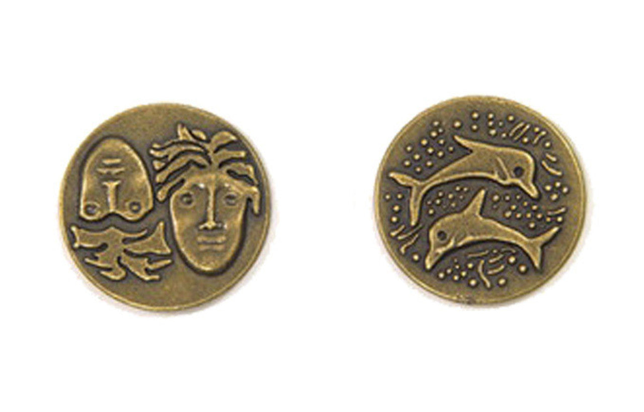 The art on these coins depict the iconic dolphins from the beautiful isle of Santorini on one side, and the two boys' opposing faces design on the other side, which was common in the period.