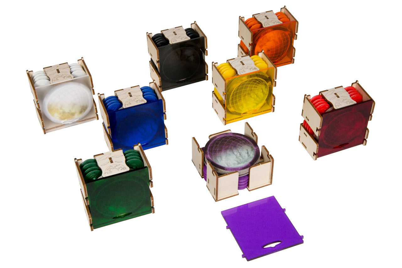 Included inside the organizer are the Alien Sheet Tray, Warp Tray, eight Bits Trays, and three Adjustable Card Trays. Encounters are stored in the Card Shoe for easy game play. Eight Player Trays with coordinating color acrylic lids and convenient ship stacks for easy setup.