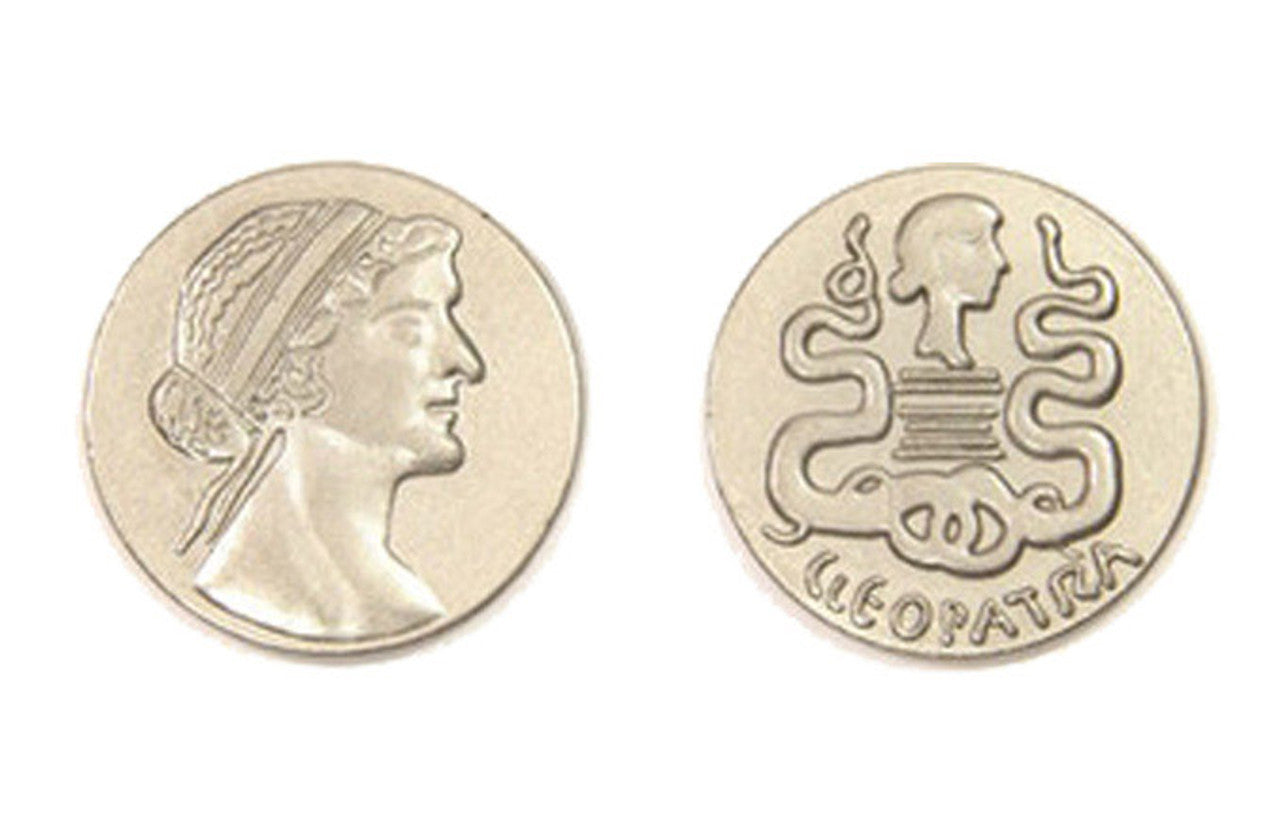 This coin was inspired by two different coins of the Egyptian and Roman empires. On one side, you have a bust of Cleopatra, and the other side was inspired by a coin from 39 BC featuring Octavia flanked by two serpents, even though the theme fits Cleopatra's end with her name written below.