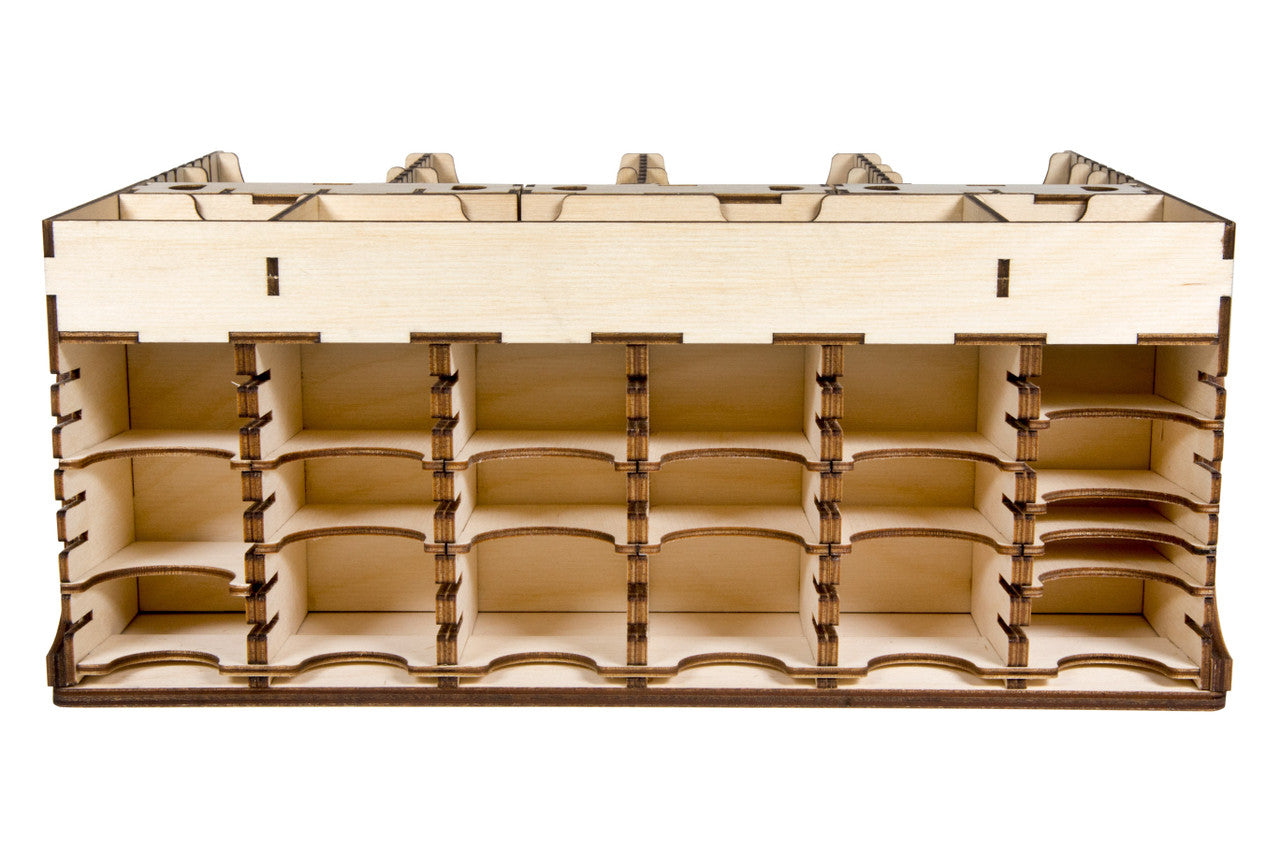 You might not be a curator of a museum full of dark and powerful artifacts, but you do have boxes and boxes of unorganized terror of your own. Keep from losing your sanity with the Elder Signs Compatible Game Crate. This crate is designed to store all of your tokens, markers, cards and more within a premium wooden crate. It includes 3 removable trays to help store all tokens from the base game, as well as its expansions. There is plenty of room for sleeved cards with adjustable dividers including front facing card rows for the mini card decks to be used during game play. Above the mini card rows there are pockets for the dice, gate tokens, and large pocket to be used as a monster cup. A pocket in the back of the organizer holds expansion instructions, the clock, and entrance sheet. Navigating a museum trying to kill you is difficult enough, find the elder signs and save humanity with this kit from The Broken Token!