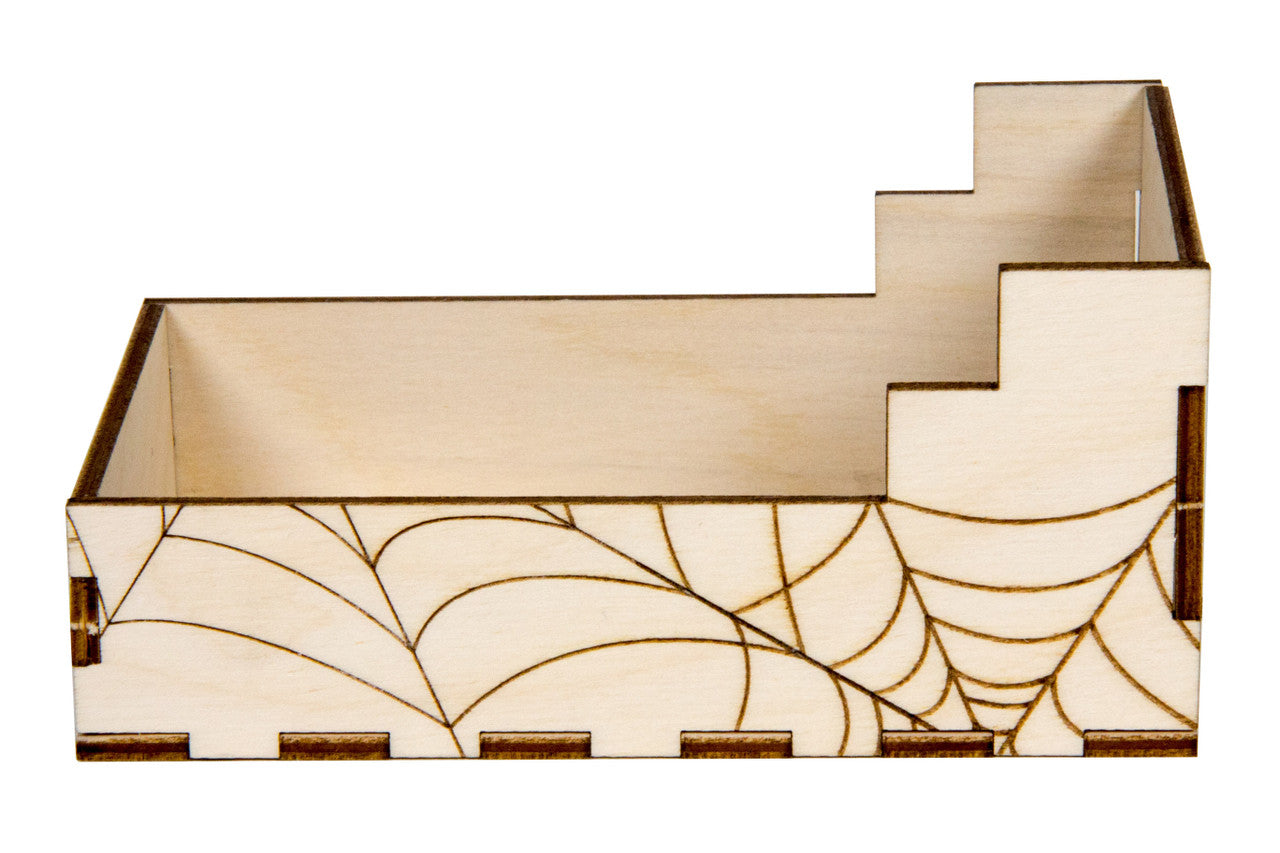 Spin your dice while creepy crawlies spin some Halloween webs around our themed mini dice tower, complete with custom engravings. Tower folds for easy travel and looks great in the middle of any gaming table. This tower ships as a kit that you easily snap together in minute, no glue required!