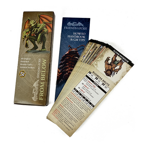 50 spectacularly-illustrated DnD monsters on dry erase friendly stat cards. Just fold them over the DM screen or prop up on the table for easy reference and tracking initiative. “From Below” contains our own creations for 5e / 2024 DnD – including new kinds of hobgoblins and goblins, undead, drow, terrifying creatures from below, and many more. Surprise and challenge even the most veteran players with these unique creatures!