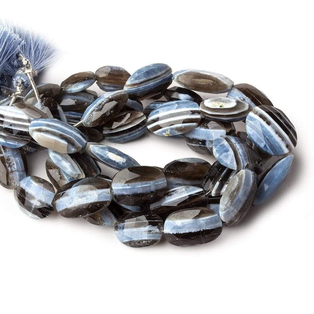 Owyhee Blue Opal faceted oval strand has a waxy luster with good polish on the fairly symmetrical oval shapes showing a tri-color beads in light to moderately saturated denim blue, creamy off white, and platinum grey hues for nicely matched banded Opal mined in Oregon, USA.