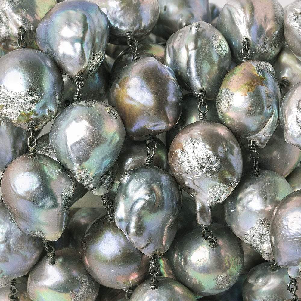 14x16mm to 14x21mm Silver Peacock Ultra Baroque Black Gold .925 Silver Chain sold by the foot with 13 pearls per foot measurement. These specific Pearls have been treated with dye and other color enhancement methods.