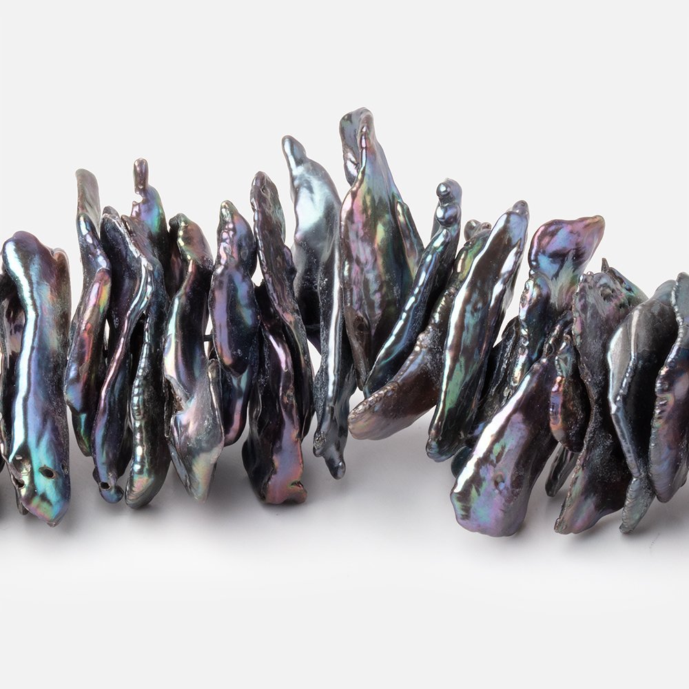 Large Peacock Center Drilled Ultra Keshi Freshwater Pearls have excellent luster, asymmetrical corn-flake like shapes, are well matched on strand for color and tone, have consistent nacre quality throughout the strand and have surface irregularities.