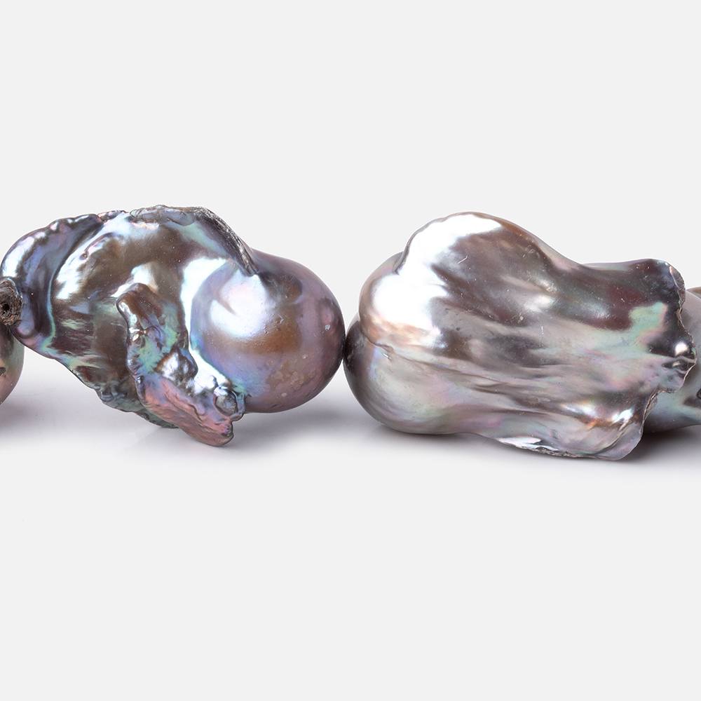 25x15mm to 35x16mm Warm Silver Ultra Baroque Freshwater Pearls show an irregular surface giving the pearl a unique appearance. These asymmetrical baroque pearls have nice nacre & high luster on a Silver Body with a slight peacock overtone. These straight drilled baroque pearls exhibit the best of baroque freshwater pearls with their size which is much larger than average and their luster which is near metallic. The drill holes measure approximately 0.8mm and the strand is well matched for orient, quality, color, and beauty providing for the AA Quality.