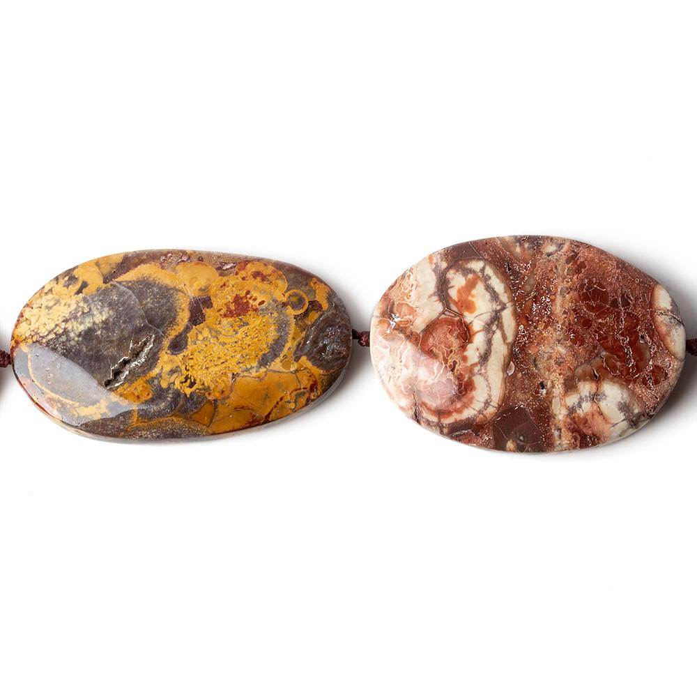Bird's Eye Agate Bead Plain Ovals measure approximately 28x20mm to 38x21mm in size, have a glass like luster, a symmetrical oval shape with polished edge, each bead on the strand is unique in composition but the color palette of mustard, aubergine, grey, dark mocha, beige and cream remains constant throughout the strand, gems may have irregular surfaces due to internal characteristics reaching the surface, the Agate beads are well matched on the strand for tone and colors, and each bead displays a beautiful pattern for a multitude of design options with a predominant Aubergine hue.