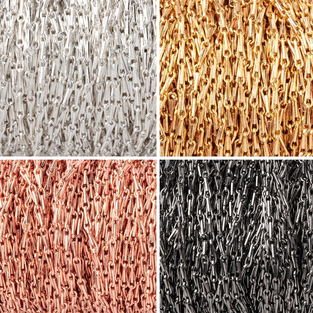 Plated Tear Drop Link Chain as a package of 3 Feet. They have a shiny appearance, exhibits precision made metal links, and has a diameter measuring approximately 1mm. Available in Silver Plated, 22kt Gold Plated, Rose Gold Plated, and Black Gold Plated.