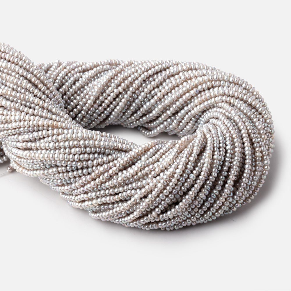 Silver Center Drilled Button Freshwater Pearls measure approximately 3x2mm on average, have a high luster, excellent nacre quality, well matched on strand, have a uniform size with a symmetrical shape, present as a color treated freshwater pearl, and the body is a medium silver hue with iridescent orient. AAA