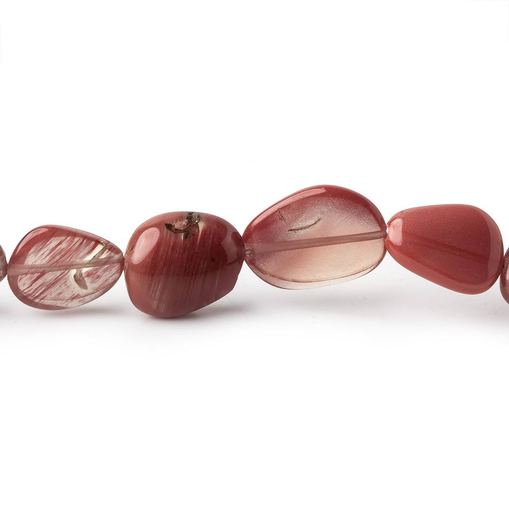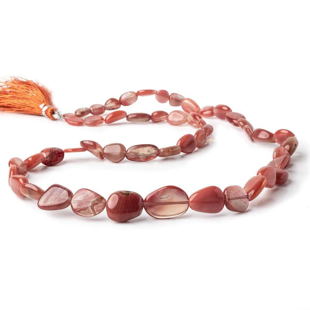 Andesine Plain Nugget Bead exhibit a vitreous luster, a nicely made asymmetrical flat shape of a deeply saturated strongly reddish brown hue, translucent bodies show faint schiller and color zoning throughout the mottled strand.