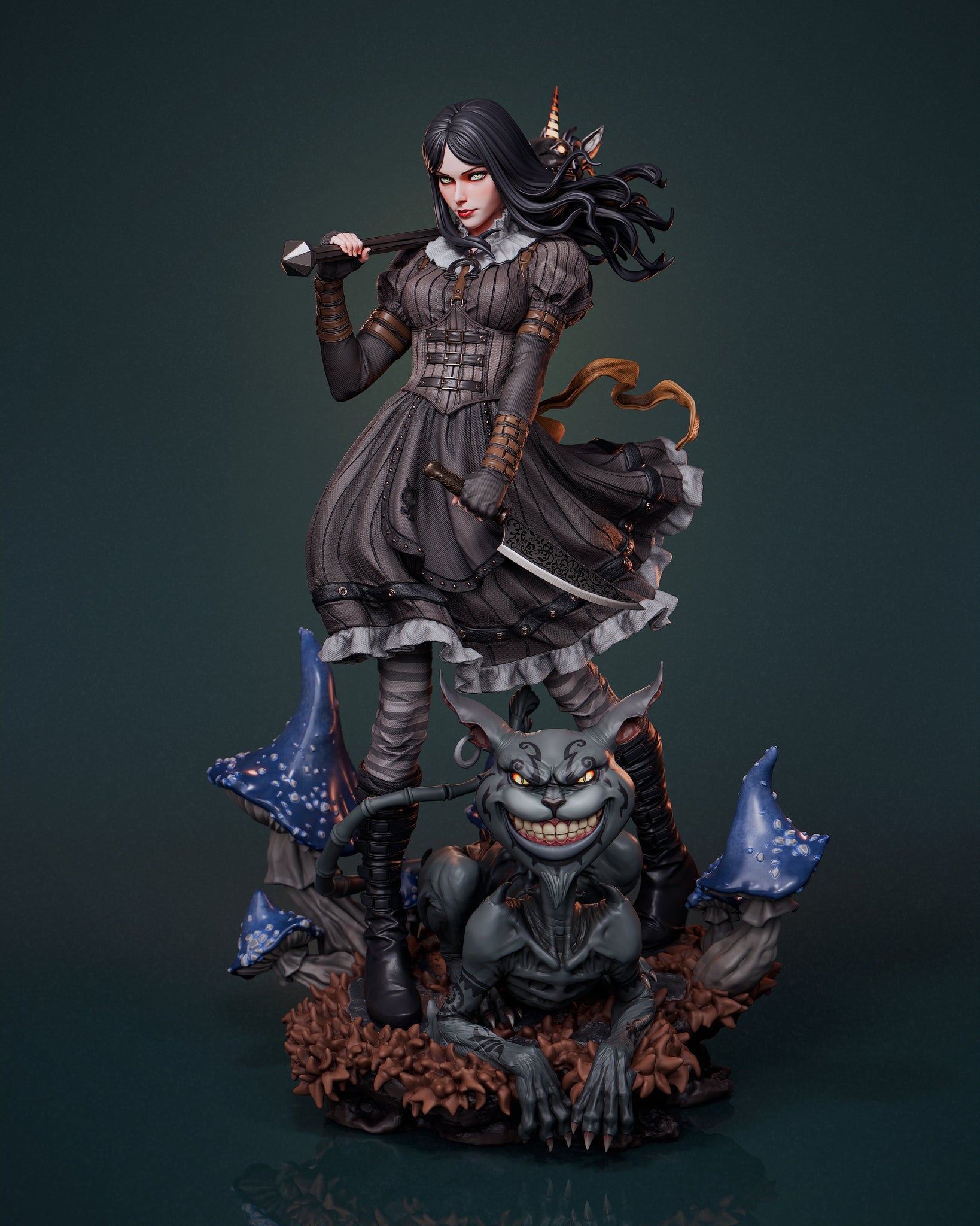 Alice Liddell steps out of the rabbit hole swinging—armed with her trusty Vorpal Blade and a hobby horse fit for smashing nightmares. This 1:6 scale collectible captures her haunting elegance from Alice: Madness Returns, featuring the twisted Cheshire Cat at her feet and gothic Wonderland flair.