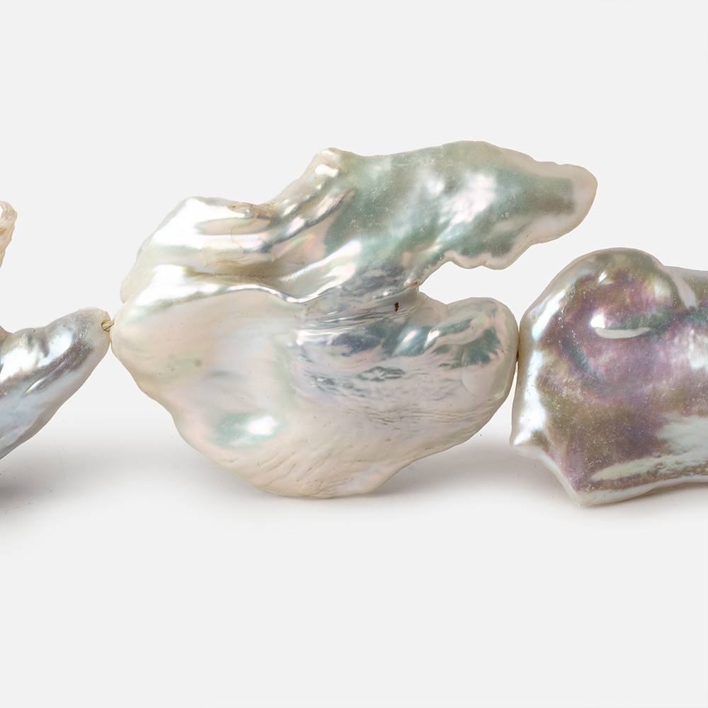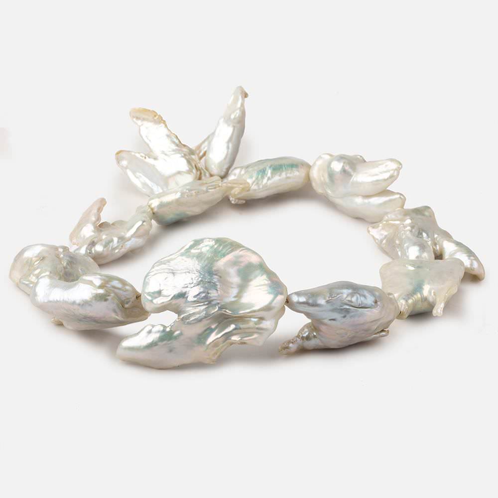 32x22mm up to 39x33mm Off White Souffle Straight Drilled Baroque Freshwater pearls are cultured with an organic substance in the center which is removed when the pearl is harvested. This process leaves the large outer shape of the pearl intact, thick, stable, with a thicker nacre than a normal pearl. Souffle pearls have beautiful luster, show an iridescent orient, are well matched for color, show great irregular shapes on the strand, and have a near weightless heft allowing for a variety of jewelry options. A grade. These pearl strands are one of a kind and the photographed items will be the one shipped.