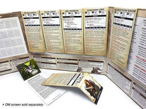 50 spectacularly-illustrated DnD monsters on dry erase friendly stat cards. Just fold them over the DM screen or prop up on the table for easy reference and tracking initiative. “From Battle” contains our own creations for 5e / 2024 DnD– including new golems, orcs, sahuagin, ogres and giants, and introducing deepspawn, beastmen, mantids,, and many more. Surprise and challenge even the most veteran players with these unique creatures!
