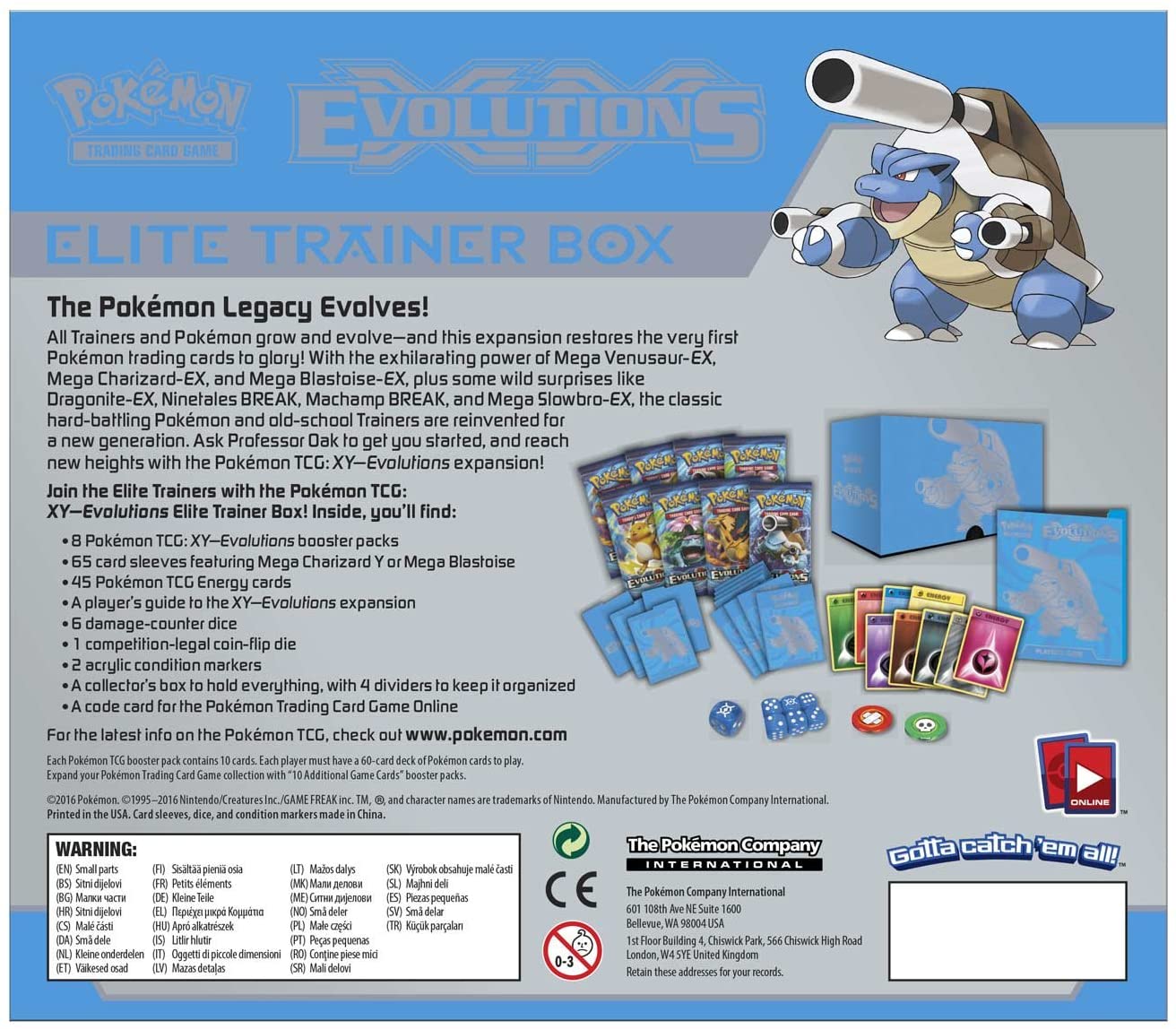 All Trainers and Pokémon grow and evolve—and this expansion restores the very first Pokémon trading cards to glory! With the exhilarating power of Mega Venusaur-EX, Mega Charizard-EX, and Mega Blastoise-EX, plus some wild surprises like Dragonite-EX, Ninetales BREAK, Machamp BREAK, and Mega Slowbro-EX, the classic hard-battling Pokémon and old-school Trainers are reinvented for a new generation. Ask Professor Oak to get you started, and reach new heights with the Pokémon TCG: XY—Evolutions expansion!