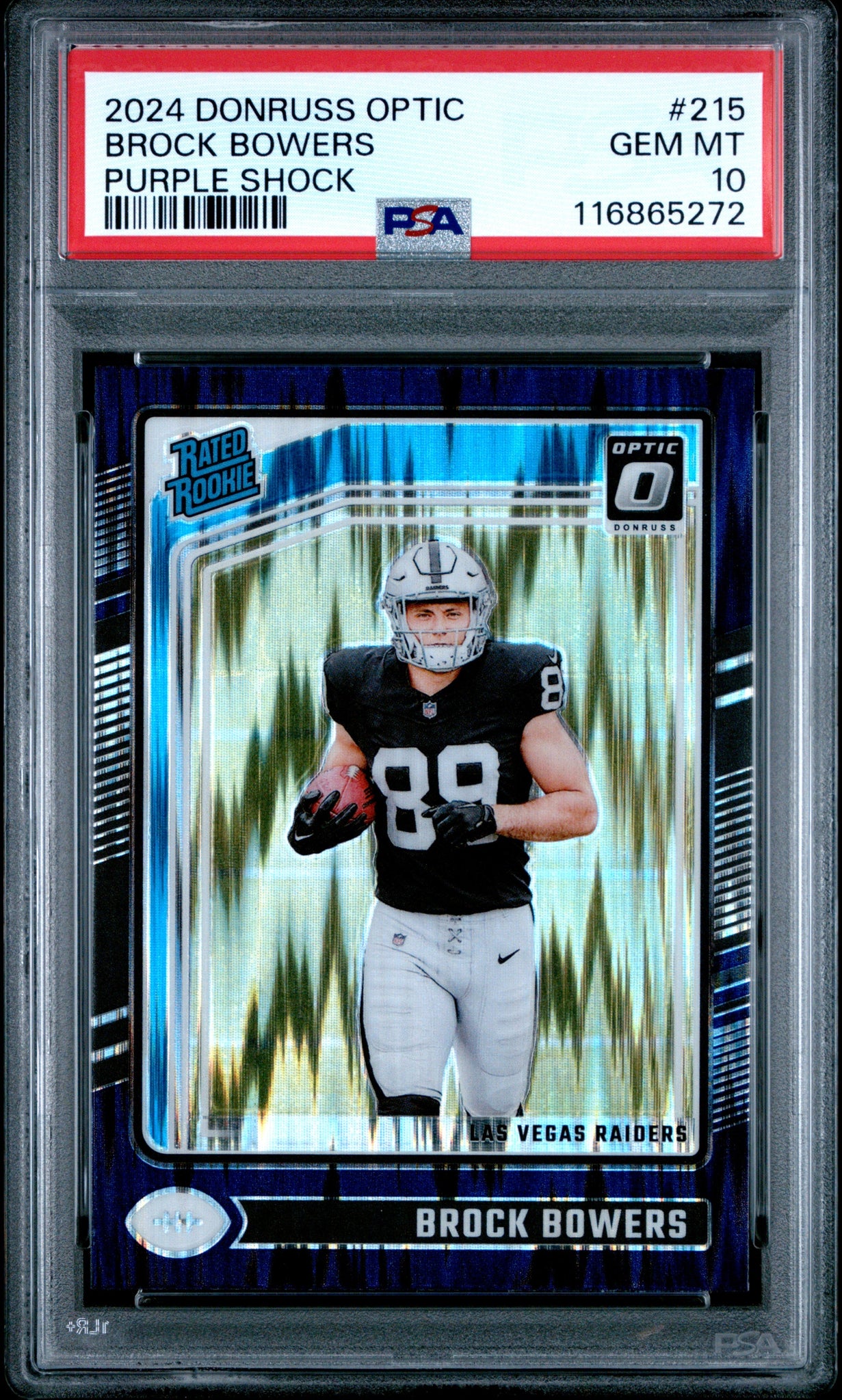 Graded 2024 Panini Donruss Optic Brock Bowers #215 Purple Shock Rookie RC Football Card PSA 10 Gem Mint (ONLINE ORDER ONLY)