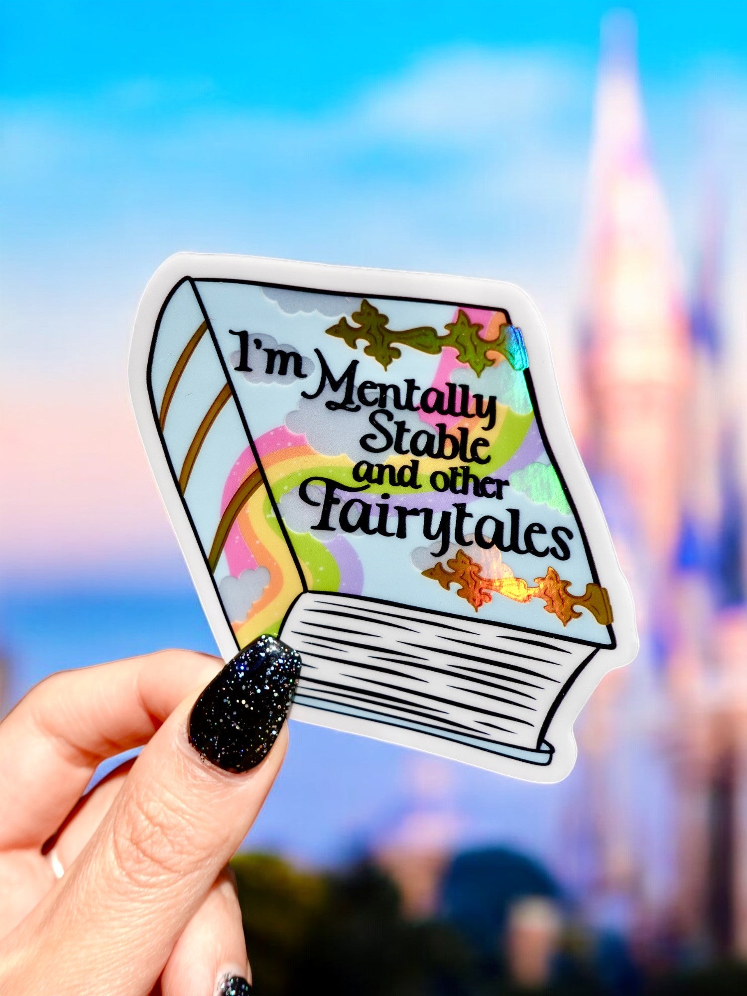 Once upon a time, we were mentally stable… just kidding. This holographic vinyl sticker features a whimsical rainbow book design with the phrase “I’m Mentally Stable and Other Fairytales.” Sparkly, sarcastic, and perfect for anyone who finds humor in chaos.