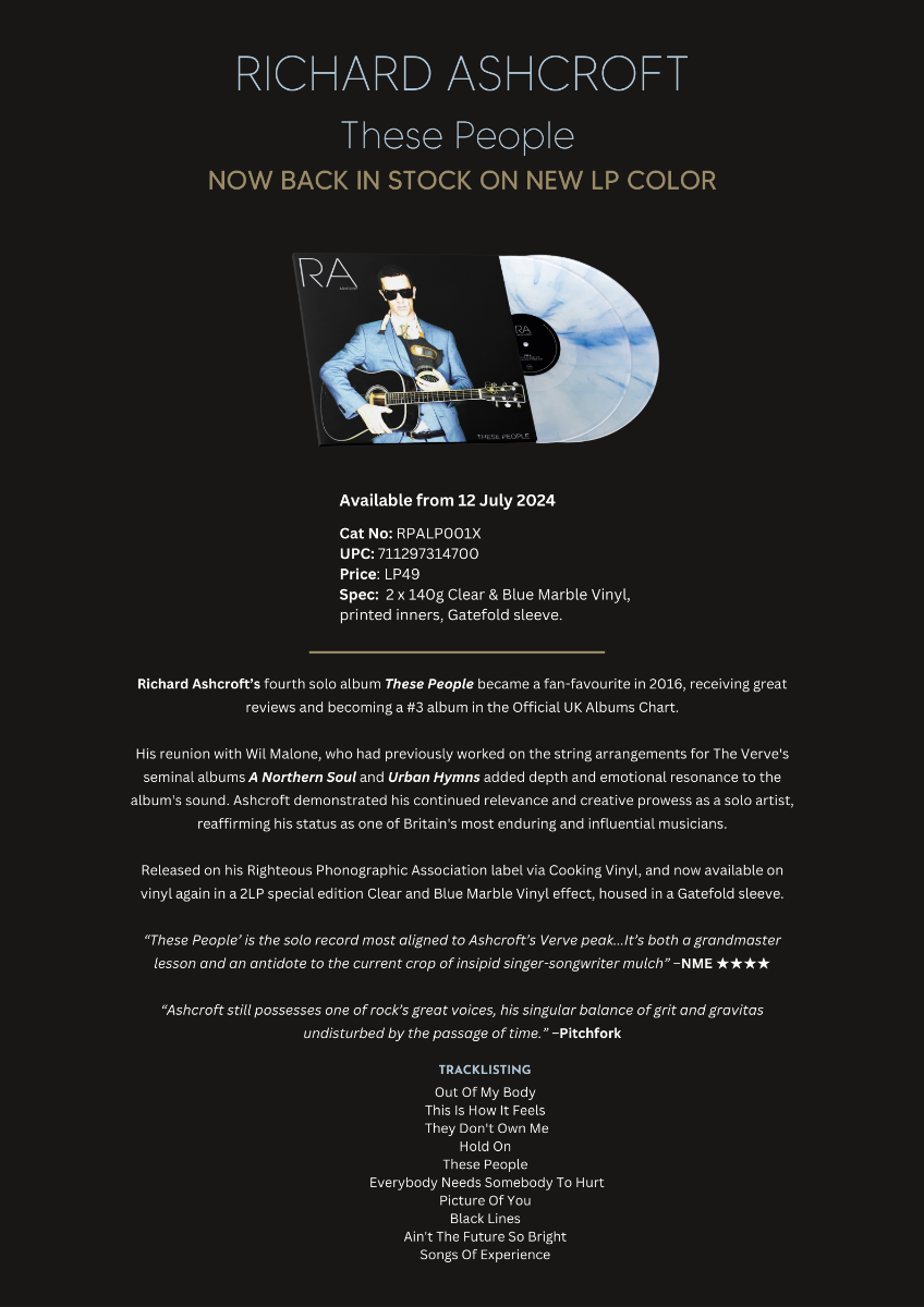 Double blue colored vinyl LP pressing. These People is the fourth studio album from British singer and musician, Richard Ashcroft, originally released in 2016.
