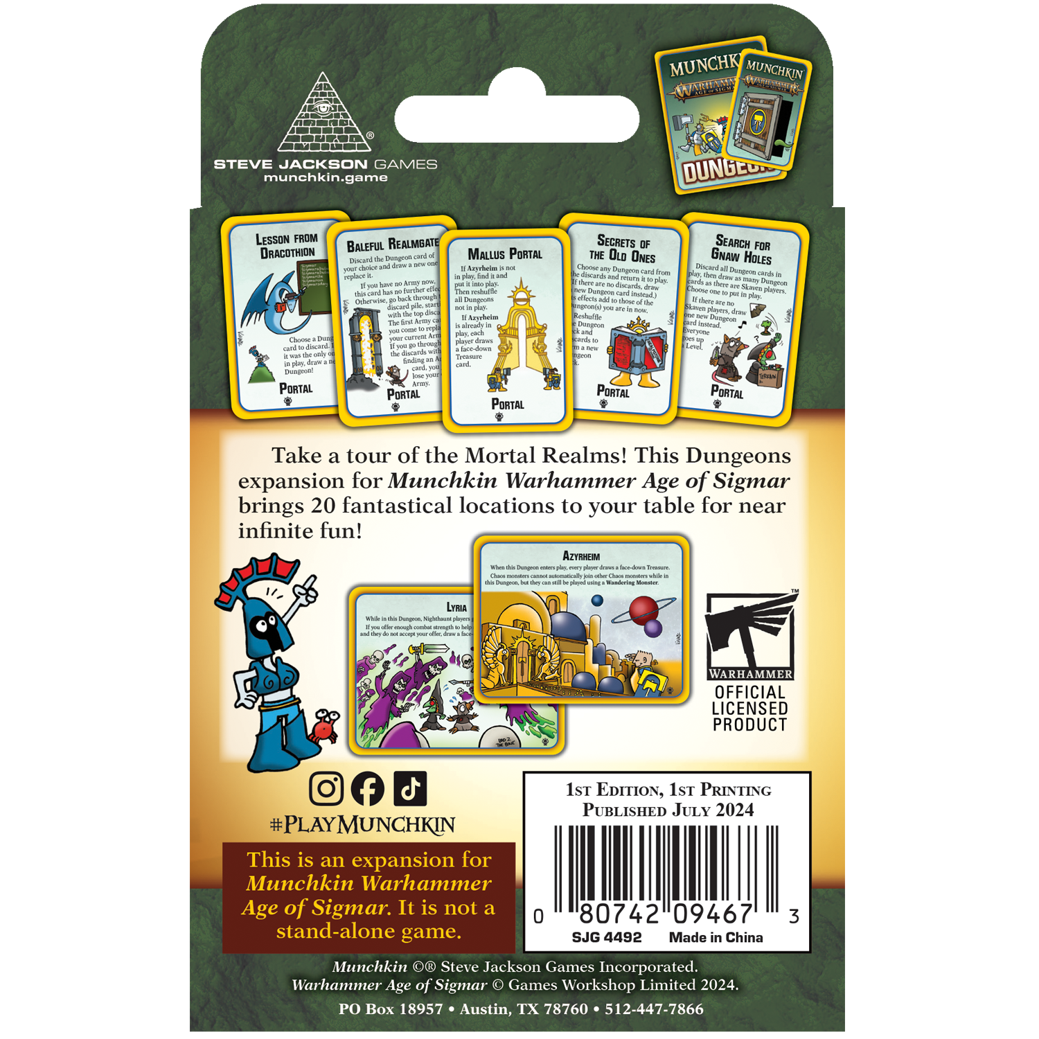 The Age of Sigmar is an epic setting in which heroes, gods, and monsters clash upon the fantastical battlefields of the Mortal Realms. Until now, you’ve had to imagine how those realms impacted your games of Munchkin Warhammer Age of Sigmar. Now you can explore 20 of these wondrous locations with the Dungeon and Portal cards found here. Betray your friends in Anvilgard, explore both sides of Hammerhal, and strike dangerous bargains with the Undead in Ulfenkarn. Take a tour of the Mortal Realms for near-infinite fun!