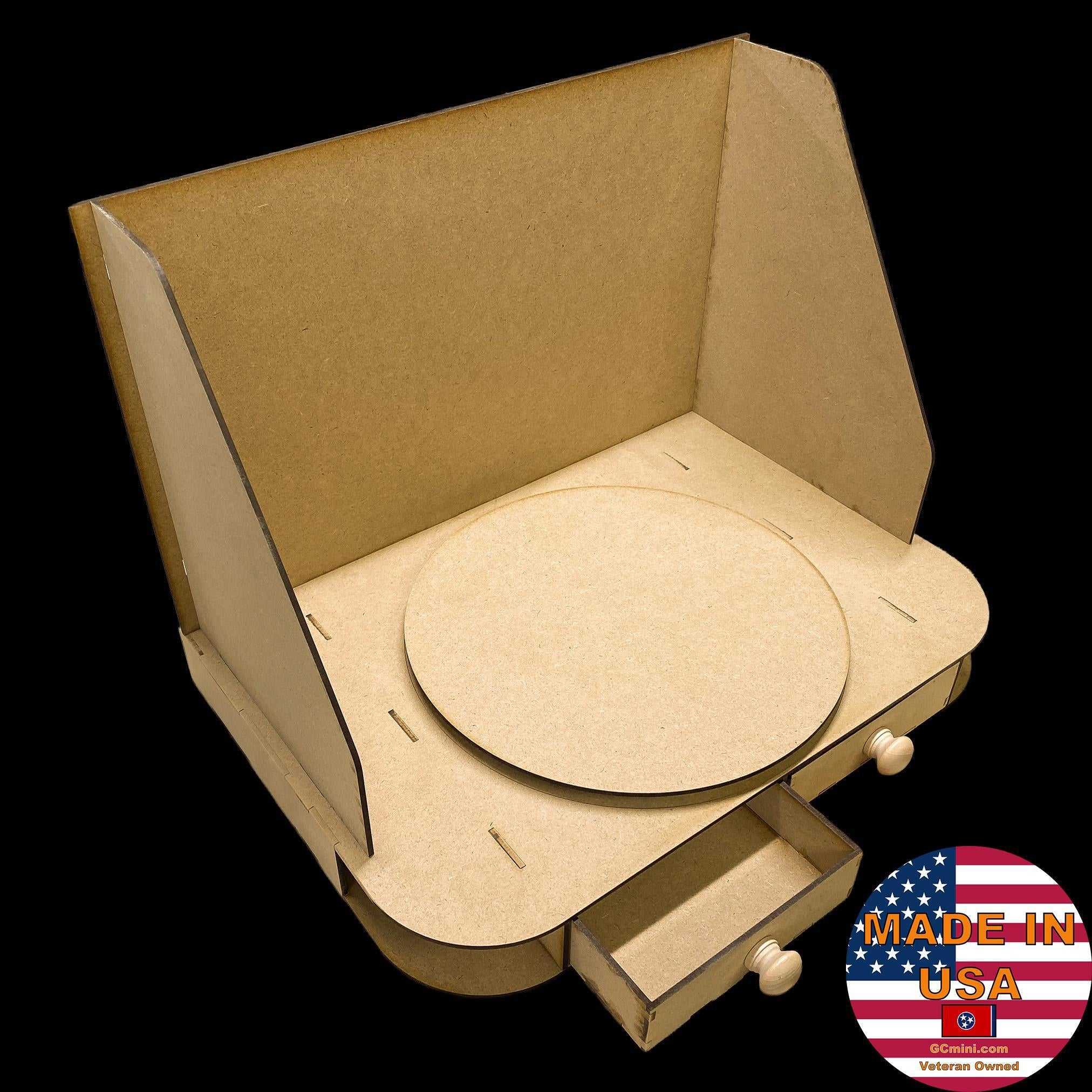 Painting station with a built-in 9 3/4" round "Lazy Susan" platform. Very handy for painting (airbrush and brush painting) miniatures and model kits.  Model can be rotated to show any side you want to work on. Side and back panels are easily removable for storage.