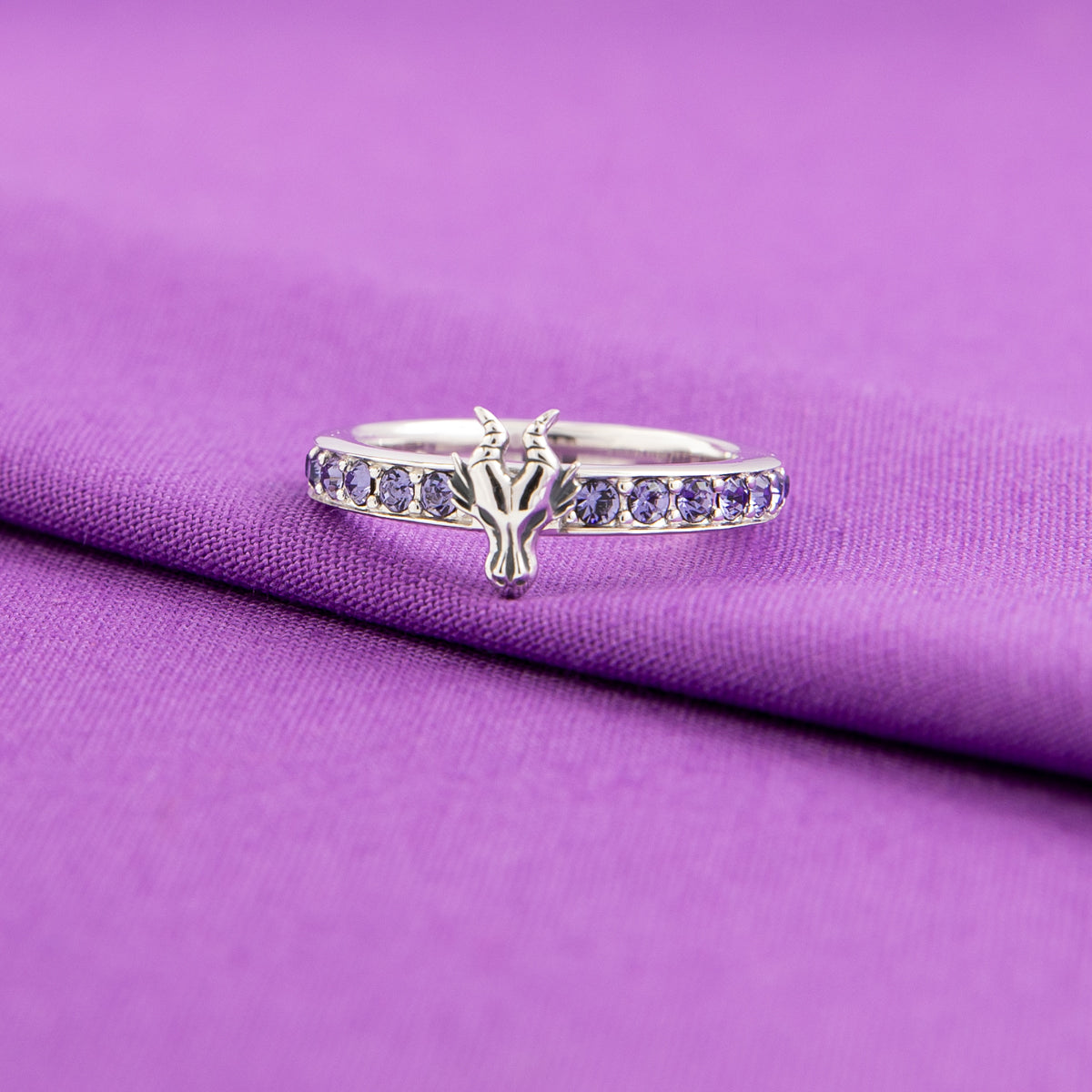 Handcrafted in polished sterling silver, sixteen exquisite purple cubic zirconia crystals flank a petite sculpted rendition of Disney’s Maleficent’s horned dragon head.