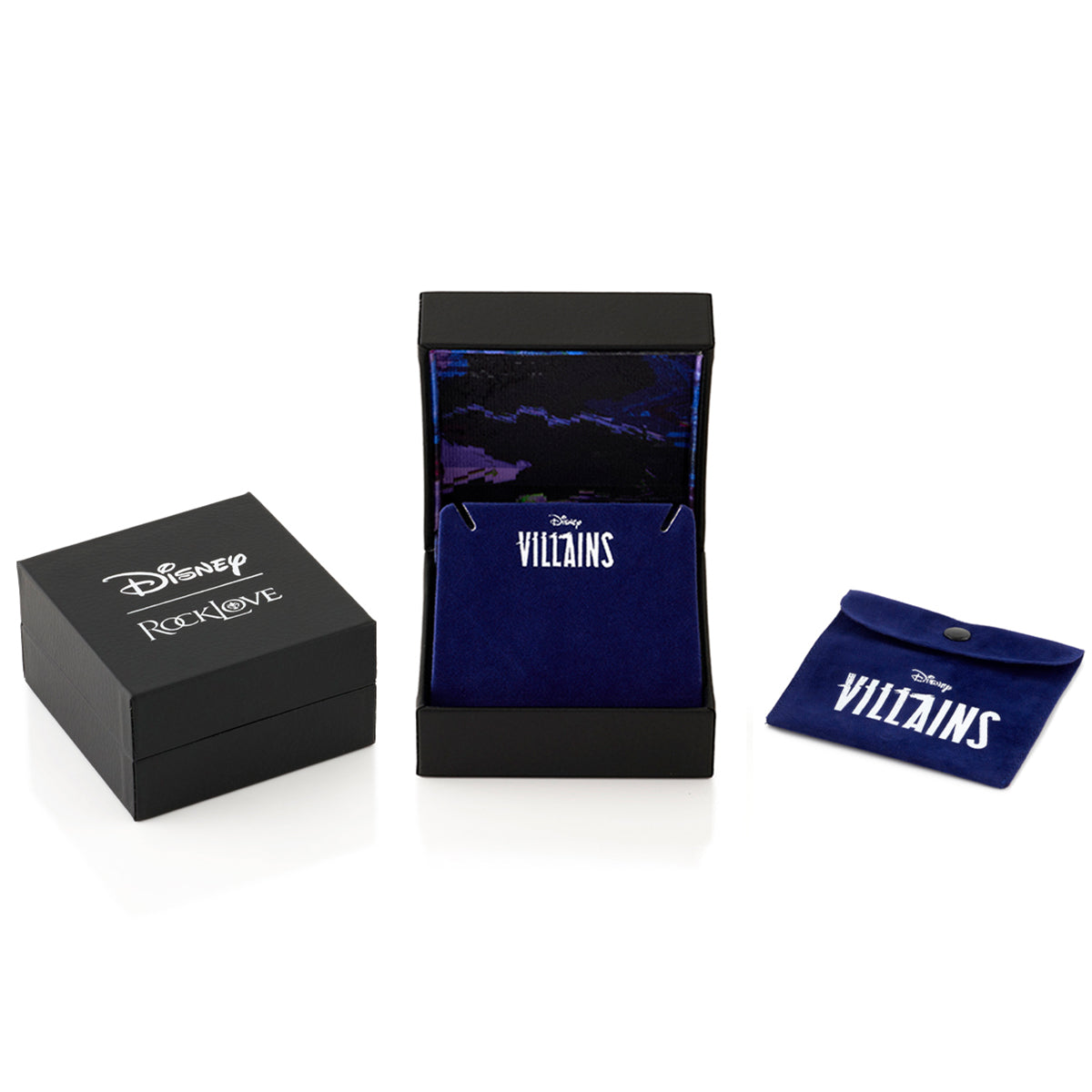 The Disney | RockLove jewelry collection arrives in a signature Boutique Box. Each of the Disney collections are designed for the true Disney collector and casual fan alike; each box comes designed full of detailed storytelling inside and out, including an embossed exterior and metallic silkscreened character art inside. Vibrant colorful flocking protects your jewelry and includes a branded luxury travel pouch!