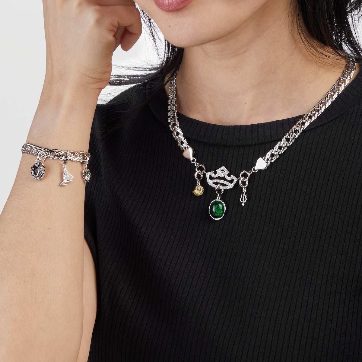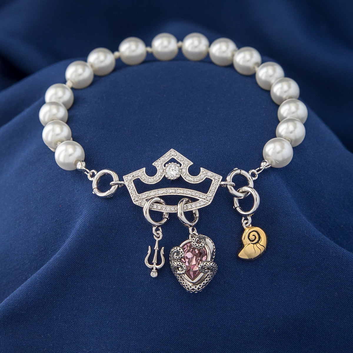 The Ursula Enhancer Set includes a 14K yellow gold plated nautilus shell, a stunning amethyst purple pear-shaped crystal ensnared by encircling tentacles, and a dainty trident accented with a sparkling white crystal.