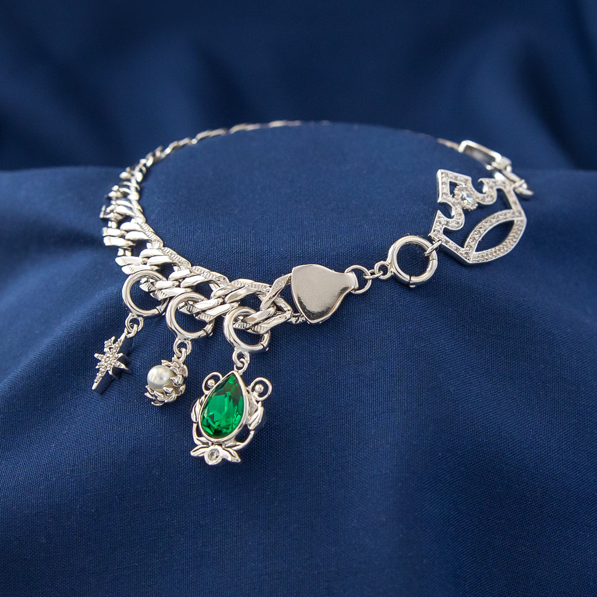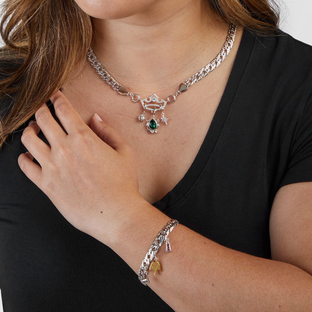 The Tiana Enhancer Set includes two twinkling stars representing Ray and Evangeline in sparkling white crystals, a brilliant emerald green pear-shaped crystal encircled by elegant swirls and leaves, and a dainty sculpted water lily blossom embracing a white pearl.