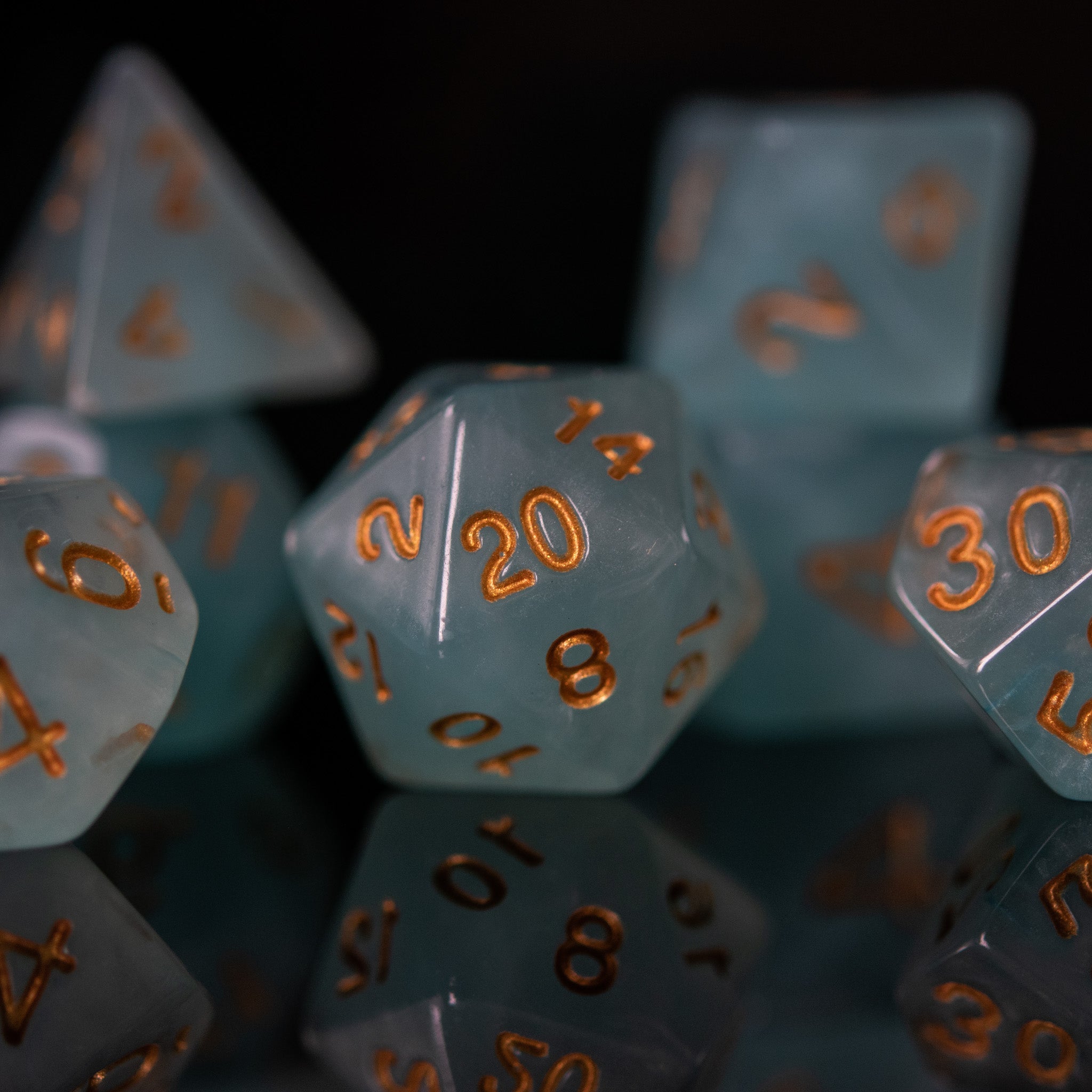 Our acrylic dice are carefully poured into individual molds and cured inside a vacuum chamber to ensure no air bubbles are trapped inside the dice. After curing, each individual die is removed from the mold and the numbers are painted by hand. These dice are perfect for any RPG and will be sure to impress at your upcoming session!