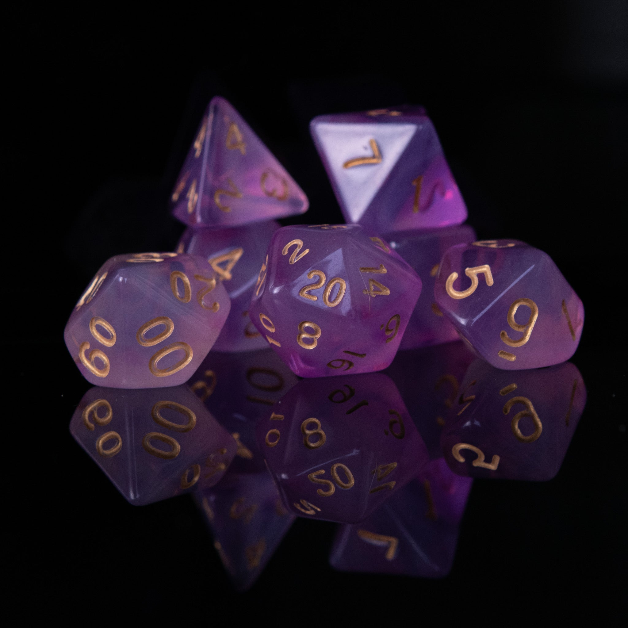 Our acrylic dice are carefully poured into individual molds and cured inside a vacuum chamber to insure no air bubbles are trapped inside the dice. After curing, each individual die is removed from the mold and numbers are painted by hand. These dice are perfect for any RPG and will sure to impress at your upcoming session!