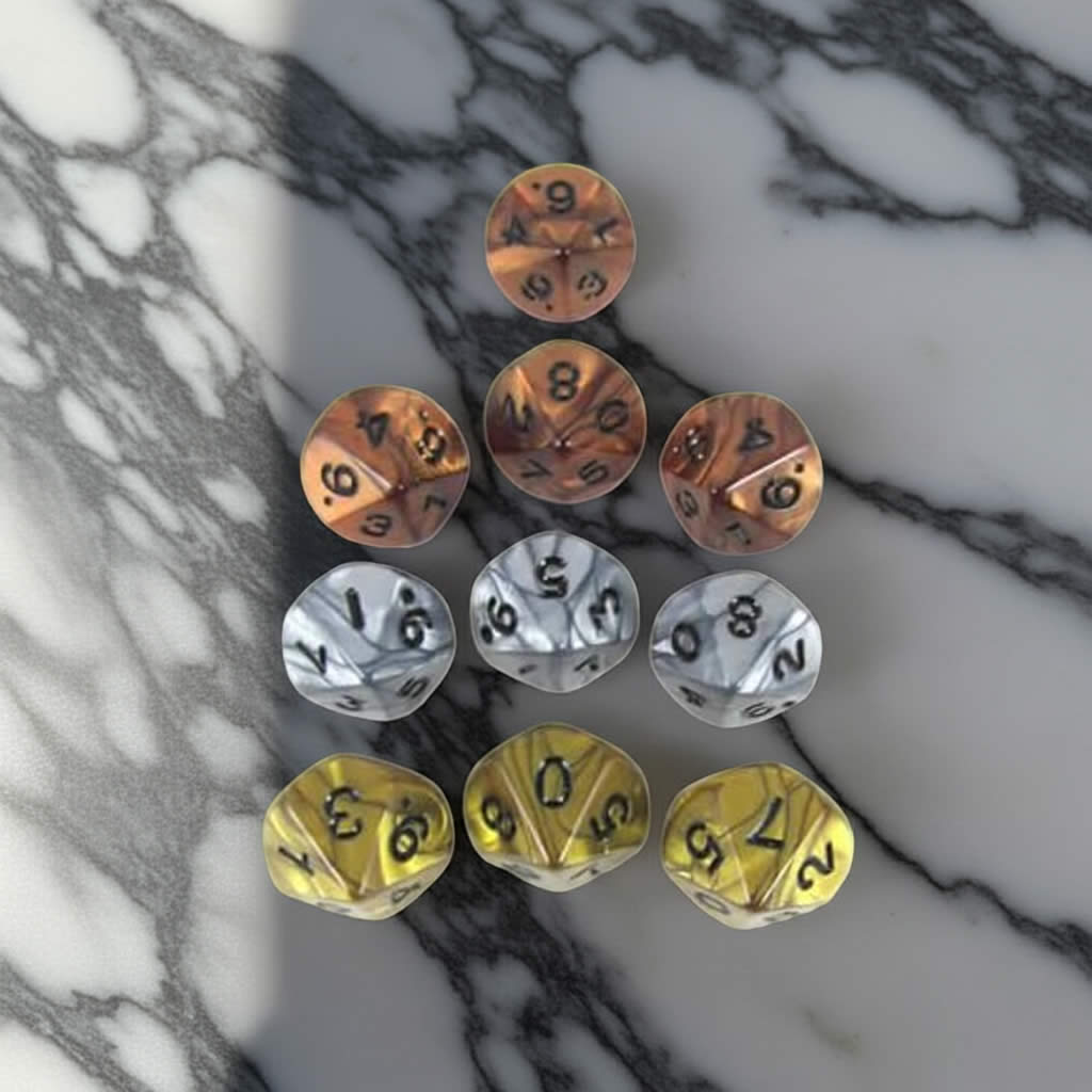 KOP13375 Assorted Olympic Dice with Black Numbers D10 16mm (5/8in) Pack of 10 Dice Koplow Games