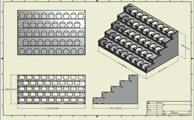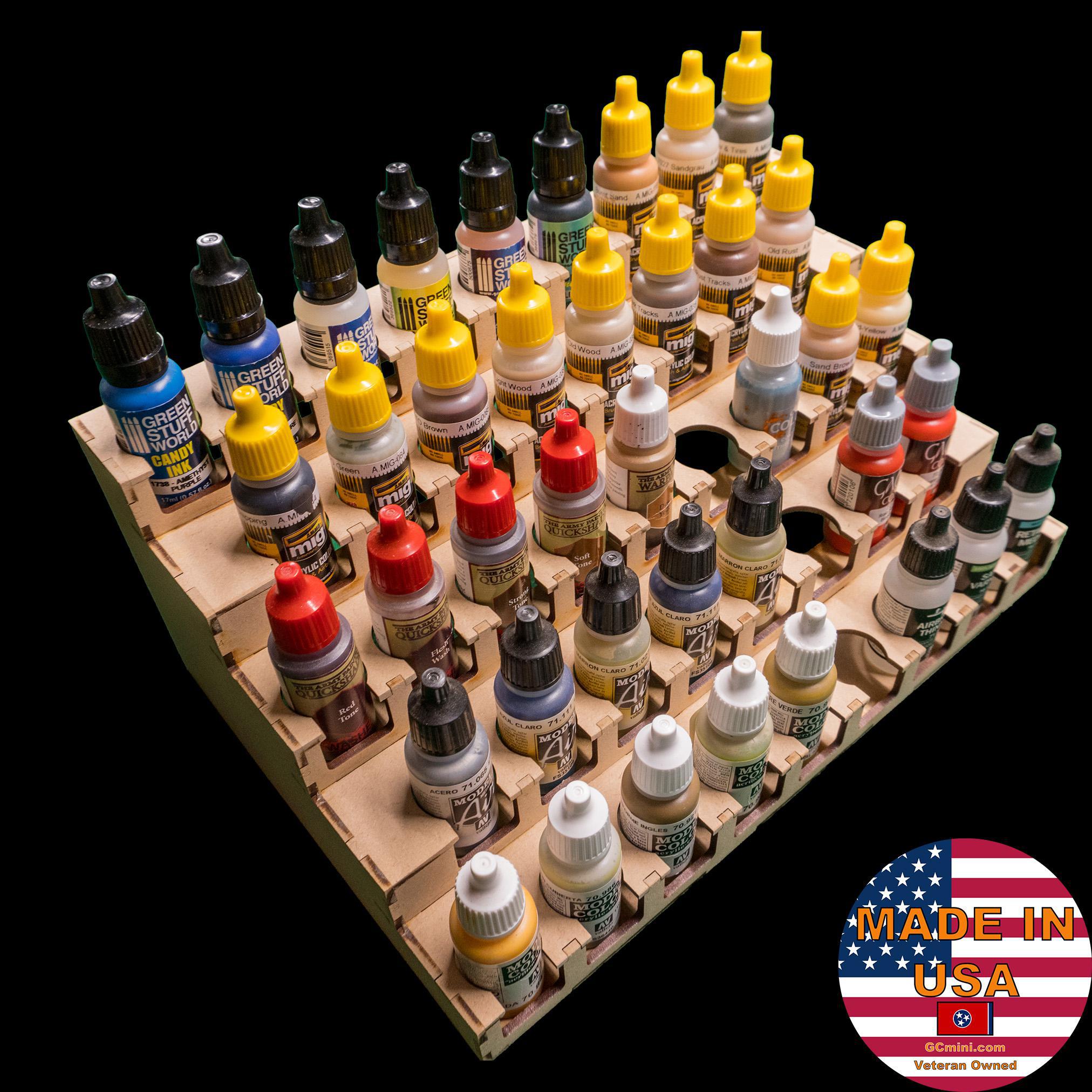 Paint rack hold 43 of the Vallejo and Army Painter style 26mm diameter dropper bottles.  Rows are staggered so that every bottle is visible at all times.