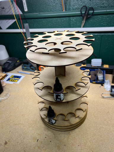 Introducing the Rotating Circular Caddy designed specifically for 31mm diameter paint bottles like the 22ml Pro Acryl paints from Monument Hobbies. Made from high-quality 1/8" MDF, this paint carousel is both sturdy and durable, ensuring your paints are stored safely and securely.