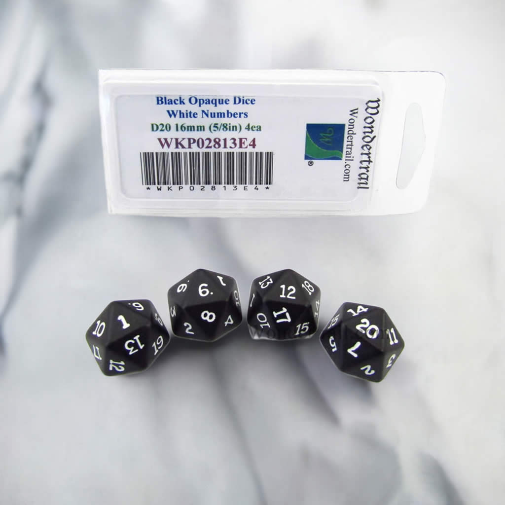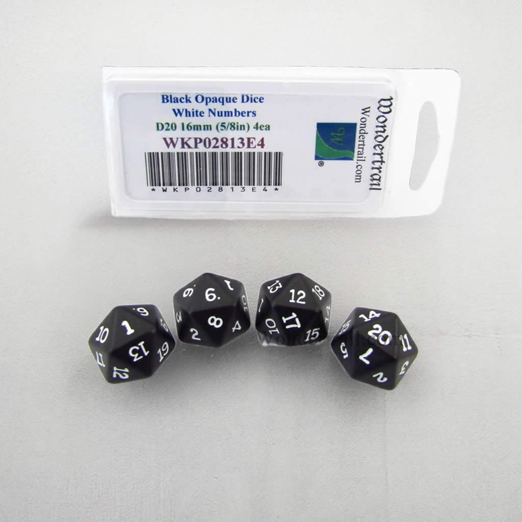 WKP02813E4 Black Opaque Dice with White Numbers D20 16mm (5/8in) Pack of 4 Wondertrail